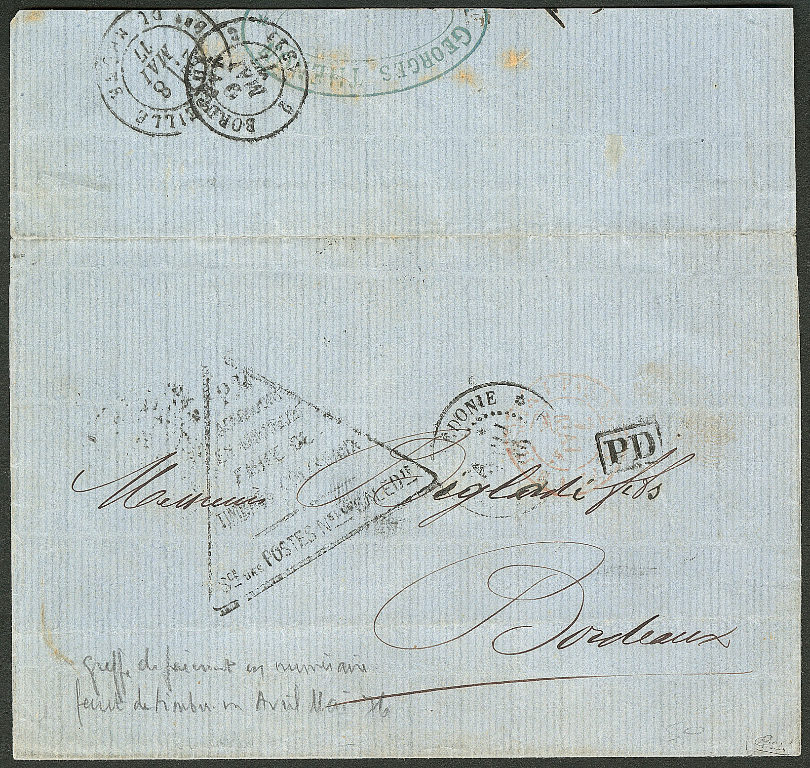 1850 | NOUVELLE-CALEDONIE. Lettre. Cachet triangulaire de paiement en numéraire. Lettre de Nouméa 17 Fév 77, avec PD et cad, pour Bordeaux. - TB | 500€ | 150€ | vendu 150€ | ||