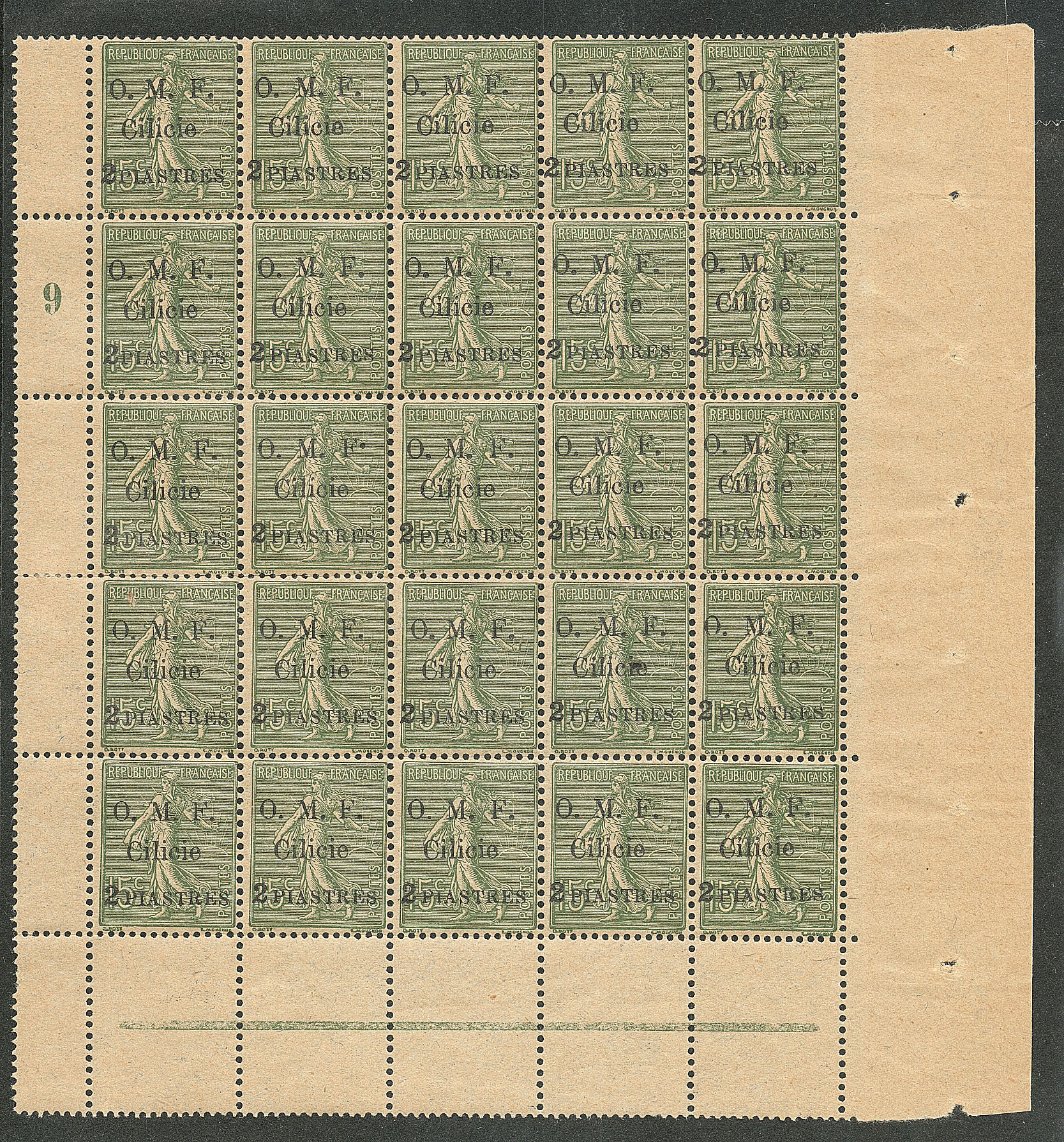 | ** | 1607 | CILICIE. ** "." plus haut. No 84a (case 27) TAN dans un bloc de 25ex mill. 9, un ex * et un ex pd. - TB (cote Yvert) | 25 | 1165€ | 350€ | vendu 479€ | |