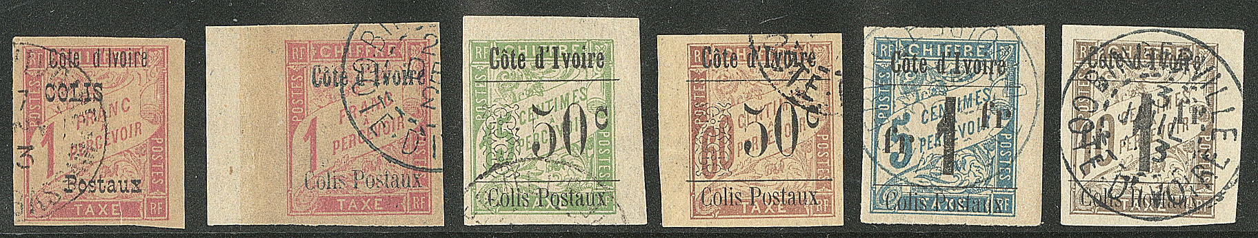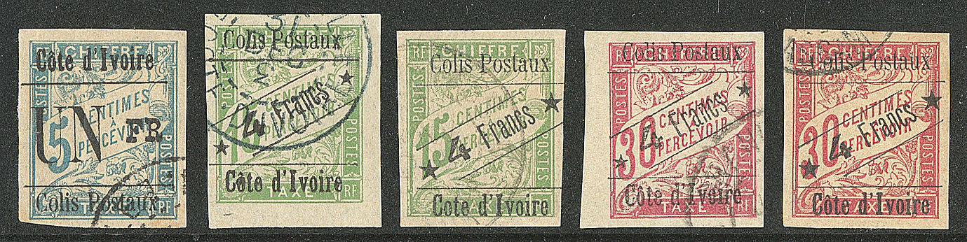 | 1666 | COLIS POSTAUX DE COTE D'IVOIRE.Nos 7g, 9, 9d, 10, 10a. - TB (cote Yvert) | 5 | 1300€ | 250€ | - | ||