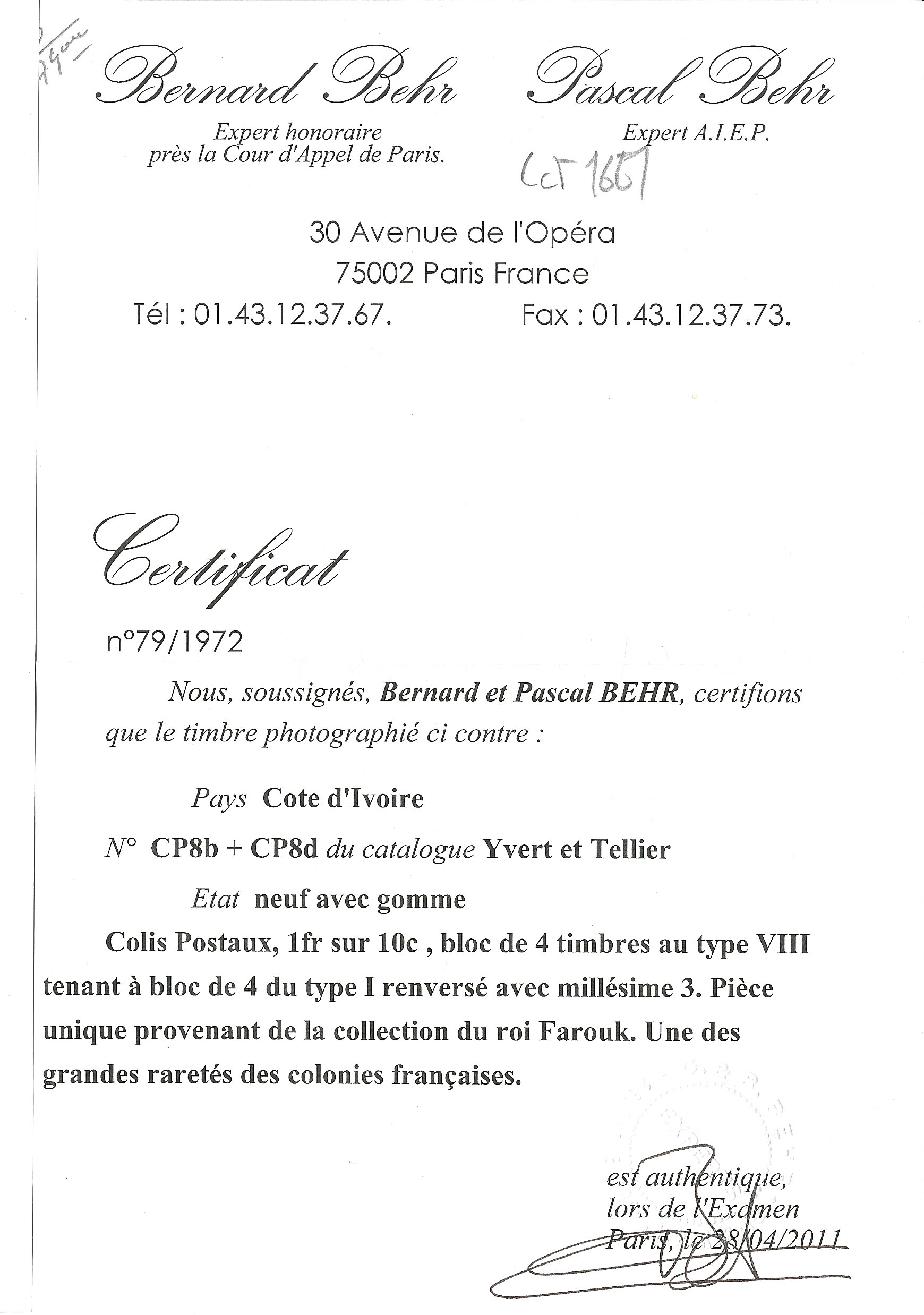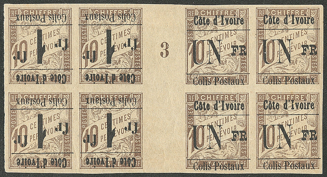 | * | 1667 | COLIS POSTAUX DE COTE D'IVOIRE. * Type VIII. No 8B bloc de quatre + 8a (surcharge renversée) bloc de quatre, formant bloc de huit interpanneaux mill. 3. - TB. - RRR (pièce unique provenant de la collection du Roi Farouk) | 8 | - | 22000€ | - | |