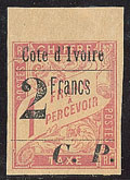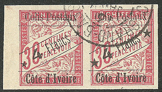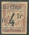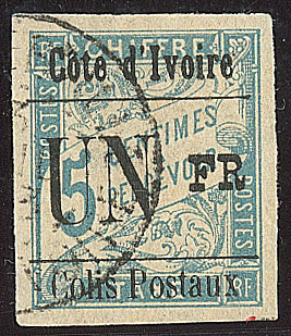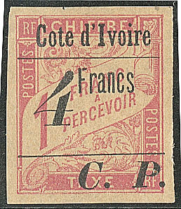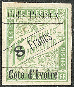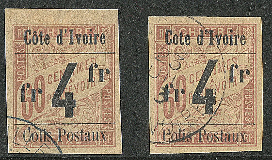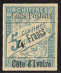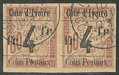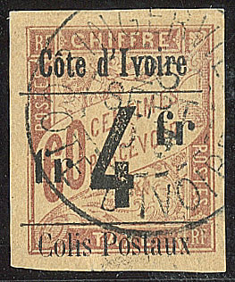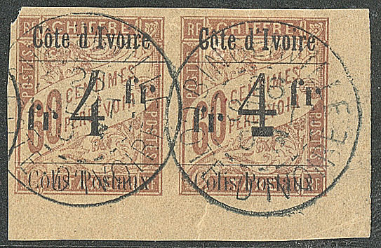 | 1657 | COLIS POSTAUX DE COTE D'IVOIRE.No 4B, sur petit fragment, léger pli mais superbe d'aspect. - R (cote Yvert) | 1 | 5000€ | 400€ | vendu 455€ | ||