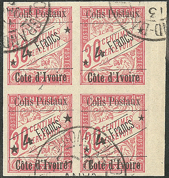 | 1674 | COLIS POSTAUX DE COTE D'IVOIRE.Sans accent sur le "o". Nos 10e (2) + 10a + 10, formant bloc de quatre bdf. - TB (cote Yvert) | 4 | 1330€ | 250€ | vendu 250€ | ||