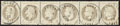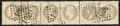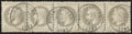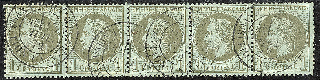 261 EMPIRE LAURE.Lyon Exposition Universelle. No 25a, vert-olive, bande de cinq (défauts) obl cad juil 72. - TB 5 - 150€ -