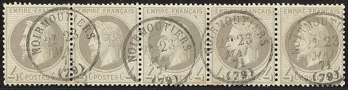 279 EMPIRE LAURE.No 27Ba, gris très foncé, bande de cinq obl cad 16 de Noirmoutier mai 71, jolie pièce. - TB 5 - 150€ vendu