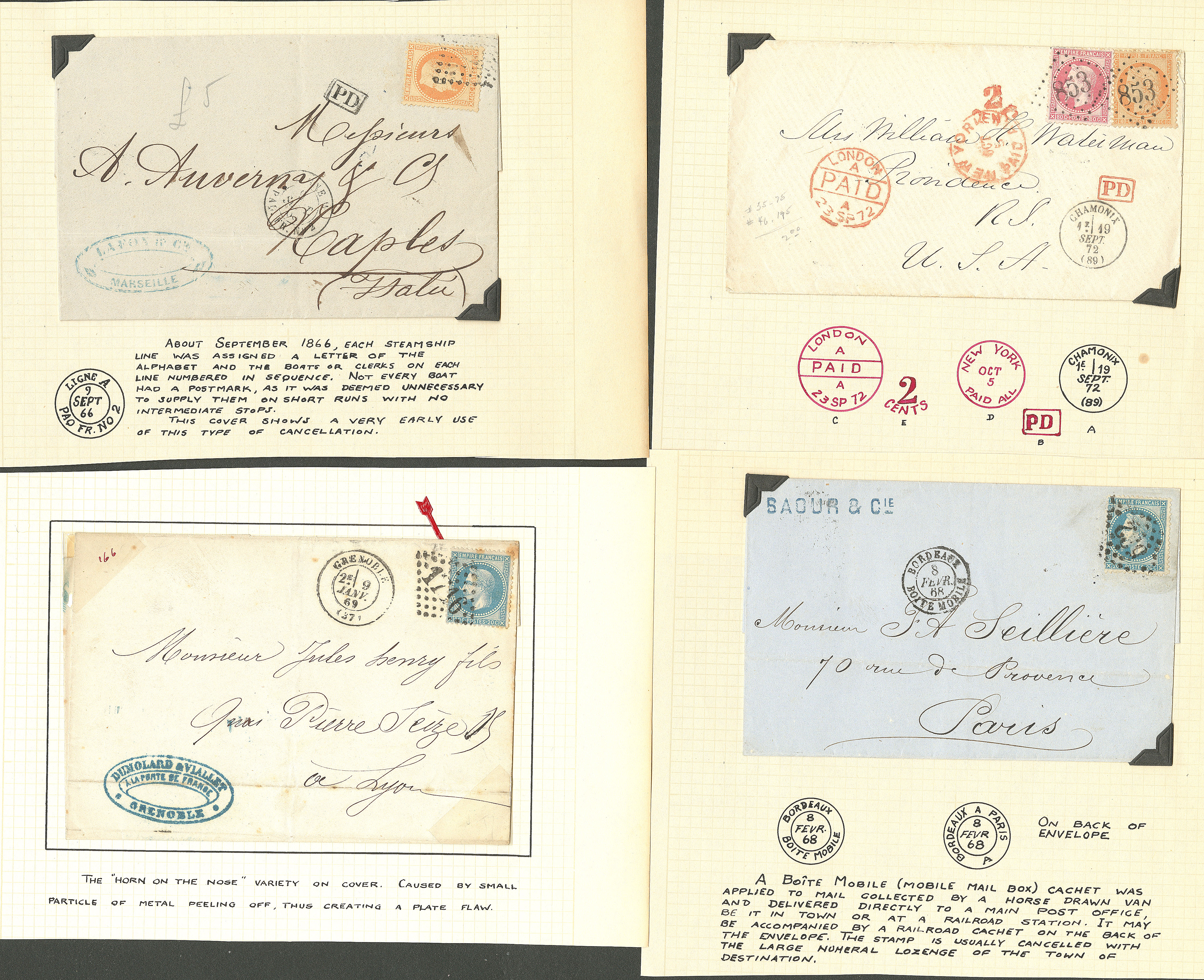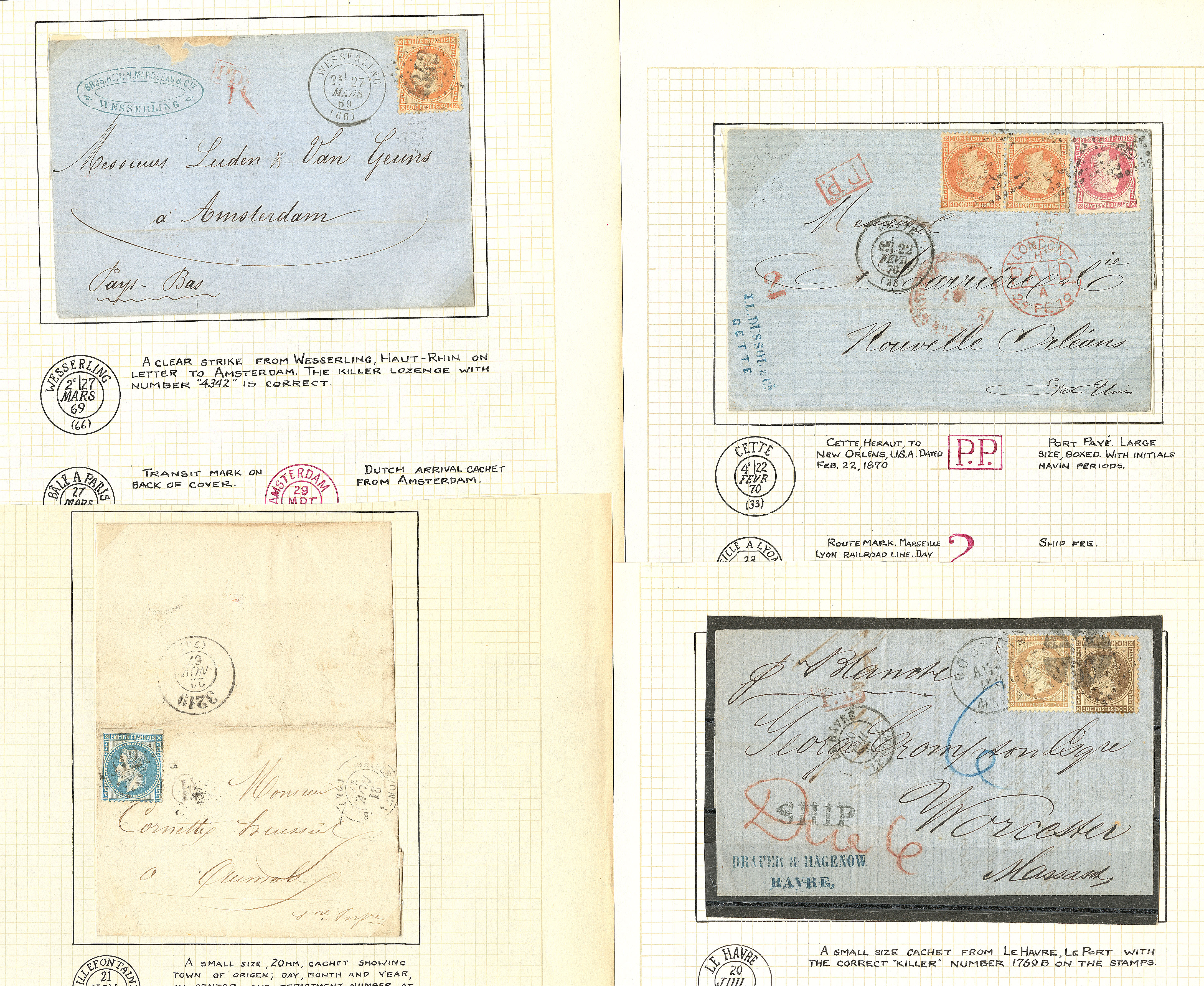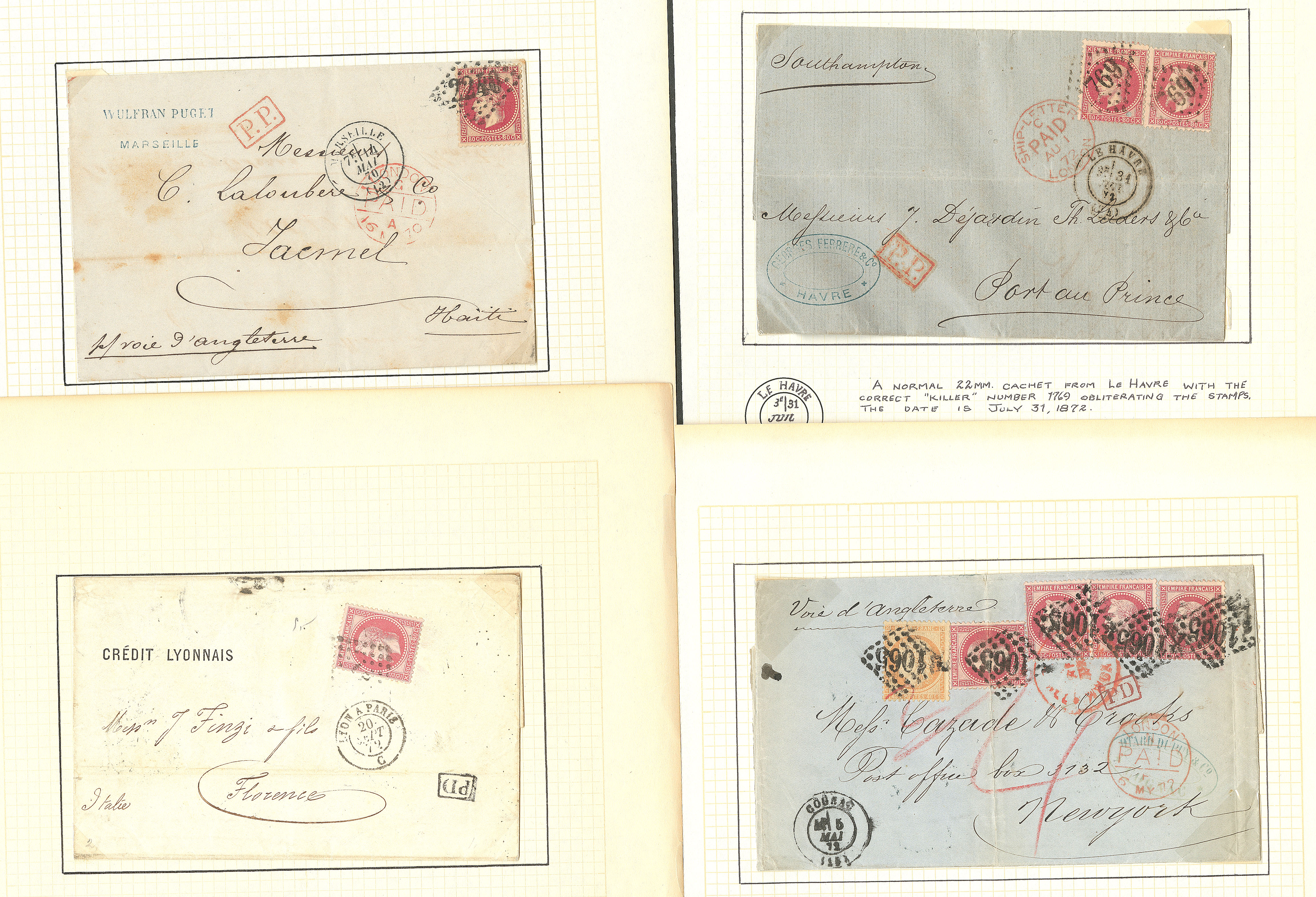 330 EMPIRE LAURE. Lettre.Lot. 1866-1872, 17 plis afft Laurés, valeurs, nuances, obl et destinations diverses dont USA. - TB ou B
