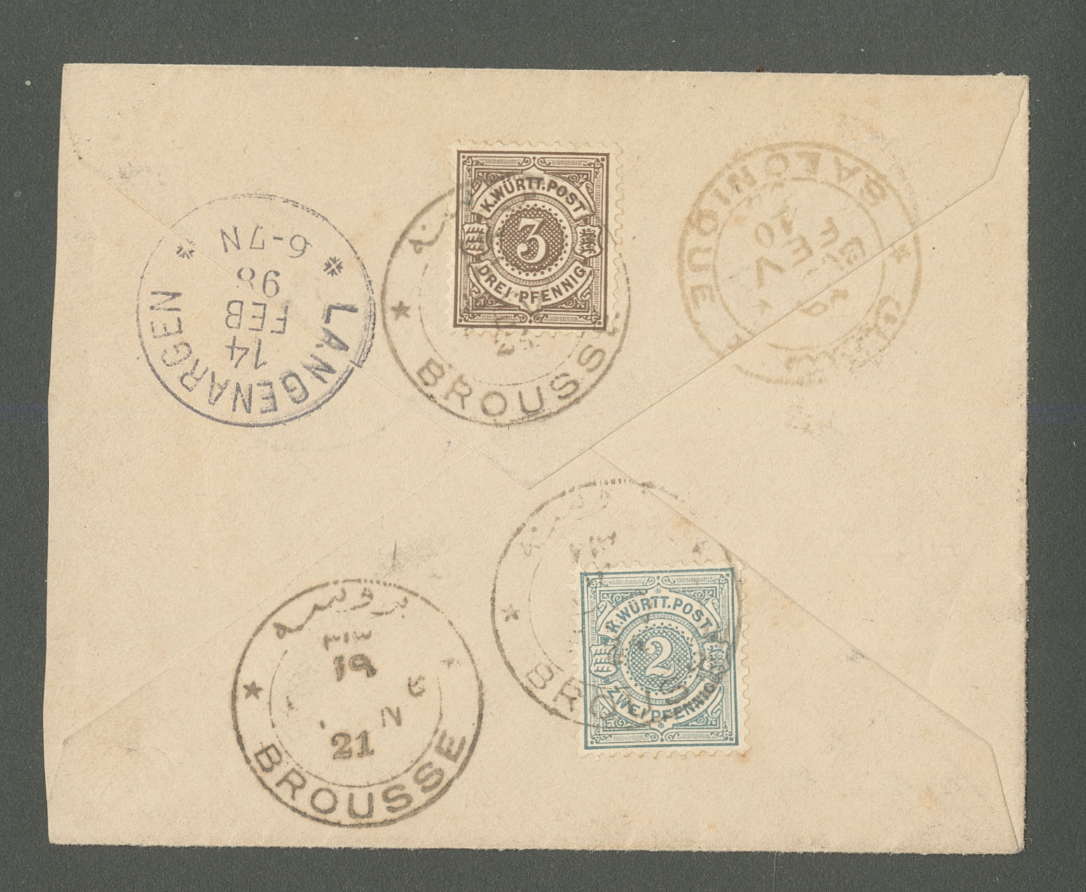 2093 | LEVANT. Lettre. No 5 sur enveloppe recommandée de Brousse afft Turquie 85 pour Salonique et réexpédiée au Wurtemberg, affranchie N°57 + 58 pour retour à l'expéditeur. - TB (cote Yvert) | 4 | - | 200€ | vendu 200€ | |