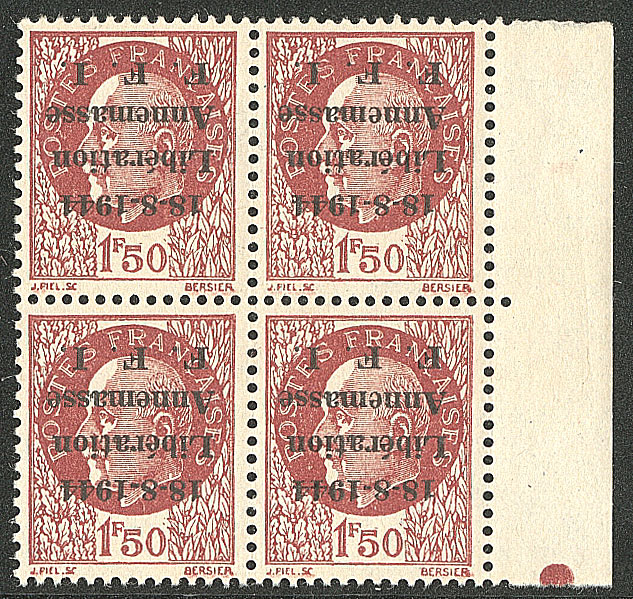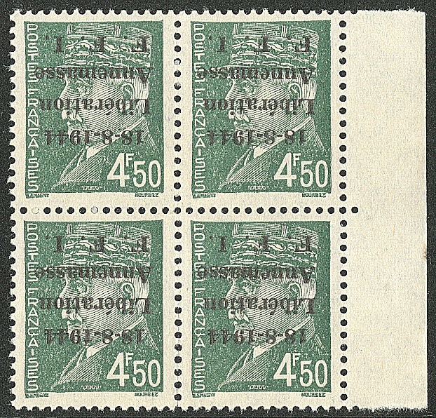 | ** | 1203 | LIBERATION. ** Annemasse. Surcharge renversée. No 6a, bloc de quatre bdf, très frais. - TB (tirage 90) (cote Mayer ) | 4 | 1128€ | 100€ | - | |