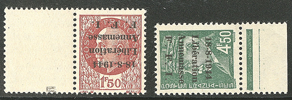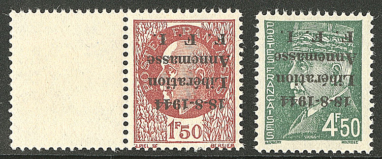 | ** | 1204 | LIBERATION. ** Annemasse. Surcharge renversée. Nos 6a bdf, 11a bdf. - TB (tirage 90) (cote Mayer ) | 2 | 564€ | 60€ | - | |