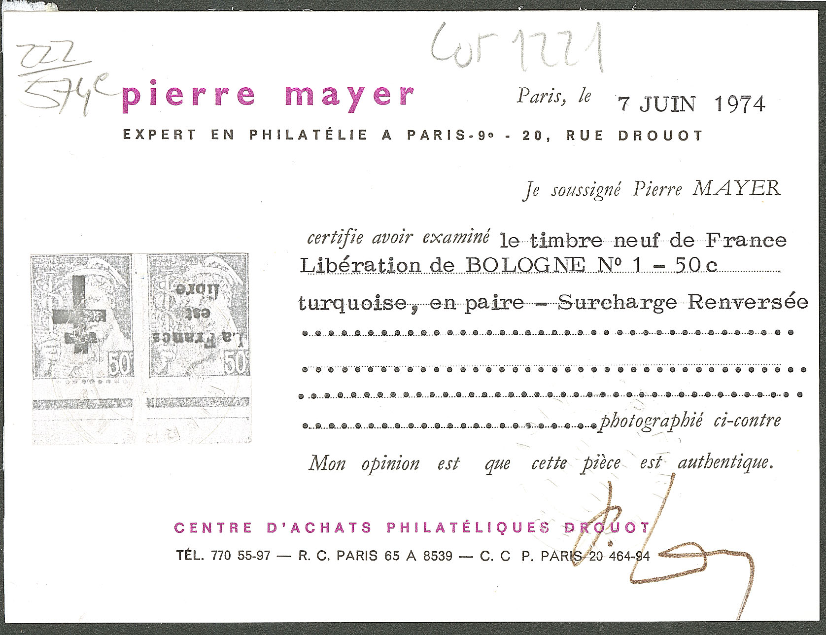 | * | 1221 | LIBERATION. * Bologne. Nos 1 paire surcharge renversée, 3 paire. Certificat Mayer - TB | 4 | - | 120€ | - | |