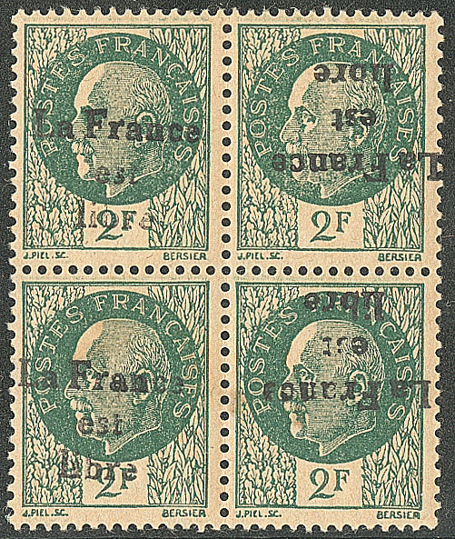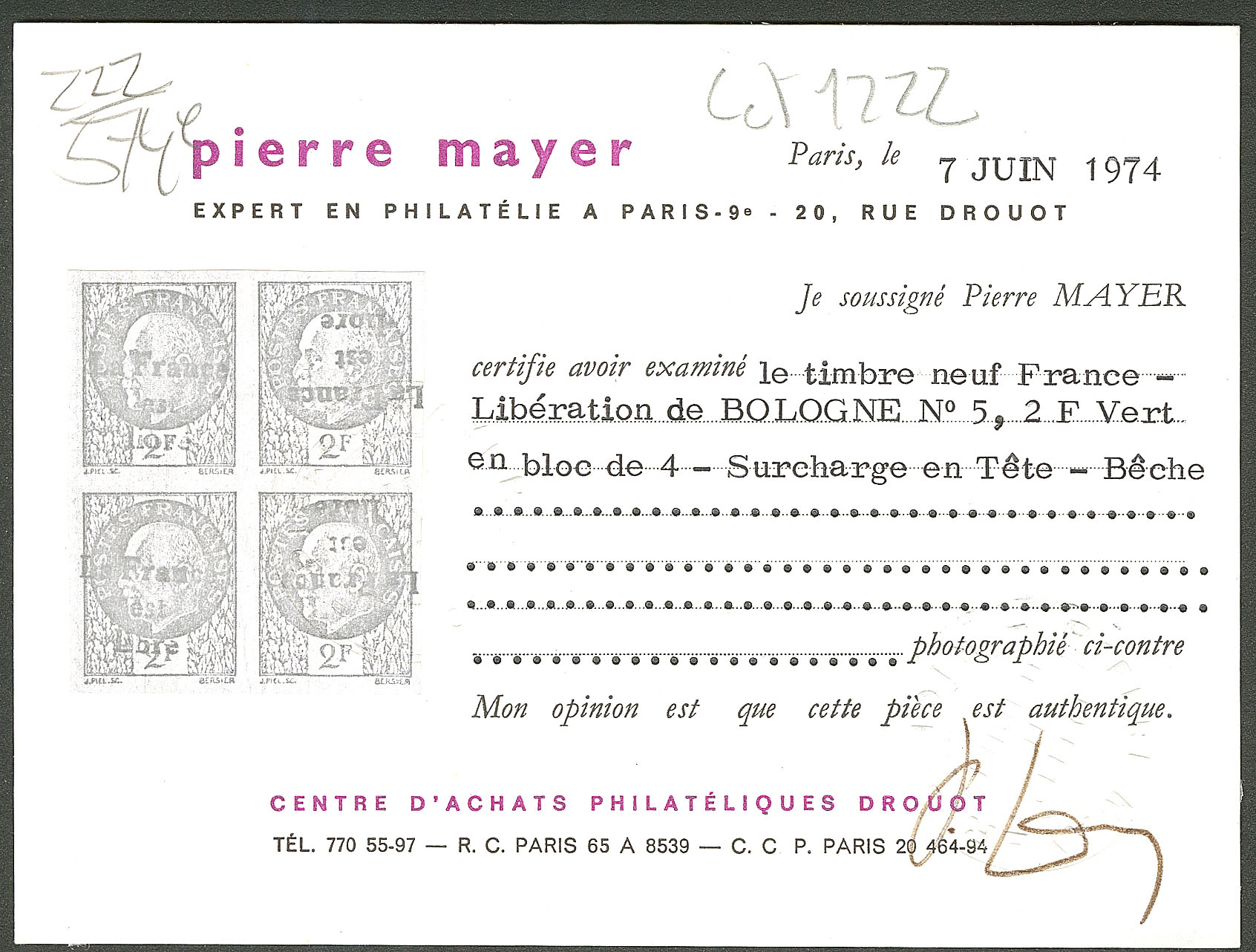 | ** | 1222 | LIBERATION. ** Bologne. No 4, bloc de quatre avec surcharges tête-bêche. Certificat Mayer - TB | 4 | - | 200€ | - | |