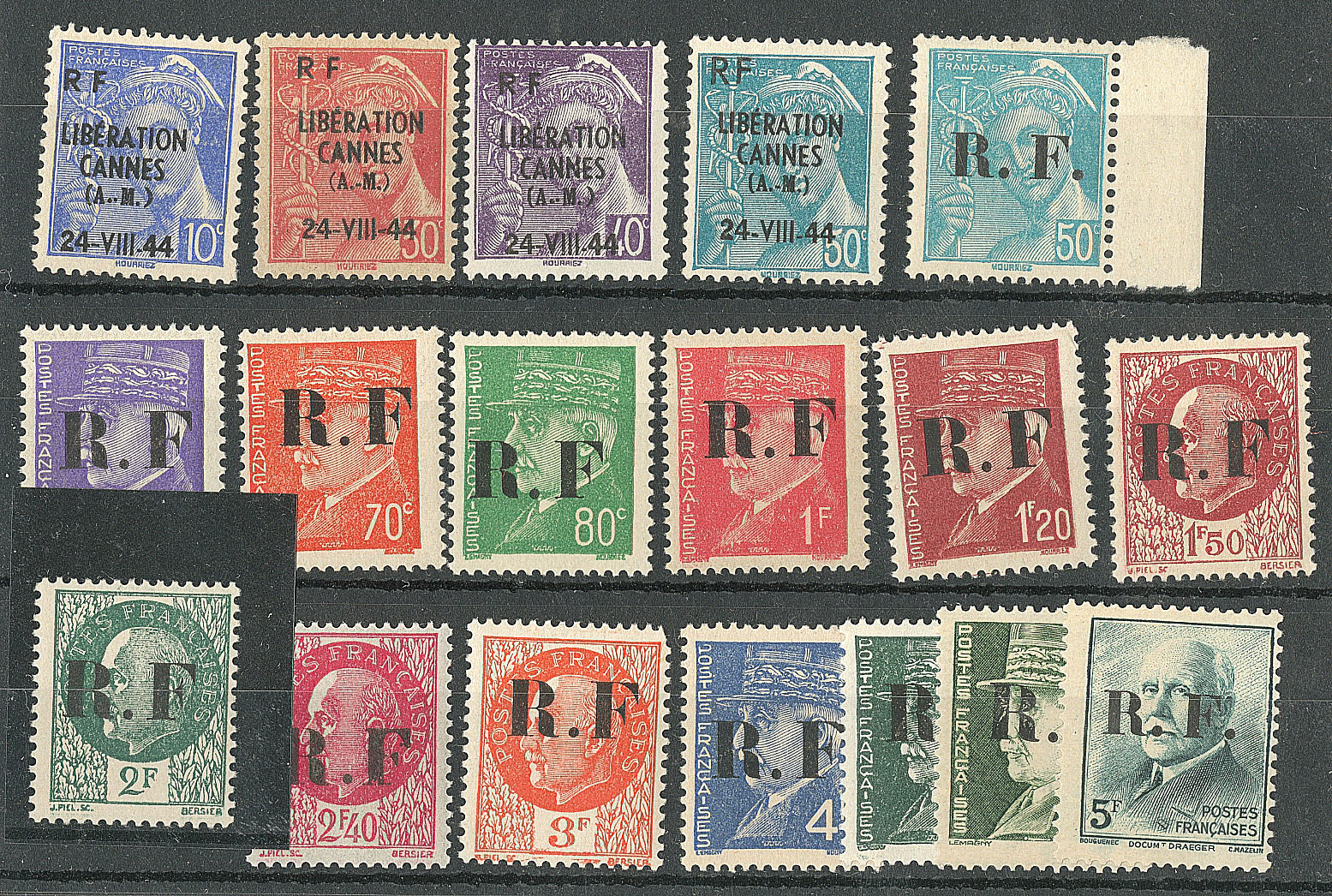 | ** | 1239 | LIBERATION. ** Cannes. Nos 1 à 4, 8, 13, 14, 16, 18 à 22, 24, 25, 27 à 29 *. - TB (cote Mayer ) | 18 | 1524€ | 200€ | vendu 200€ | |