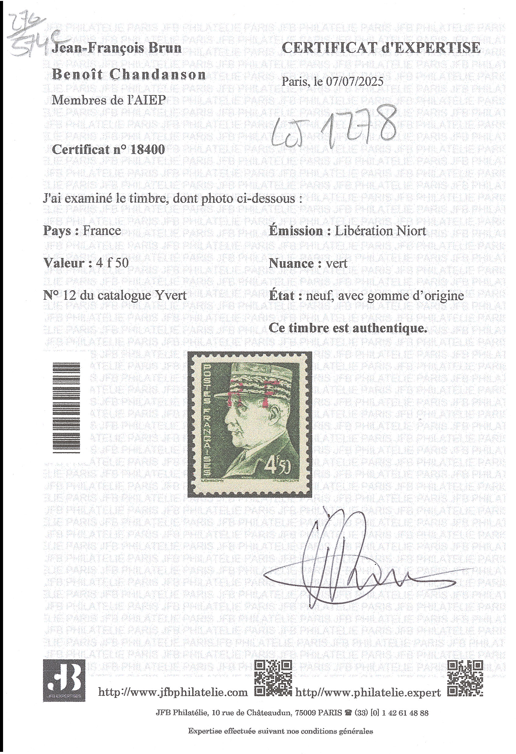 | * | 1278 | LIBERATION. * Niort. No 12. Certificat Brun - TB. - R (cote Mayer ) | 1 | 1600€ | 300€ | - | |
