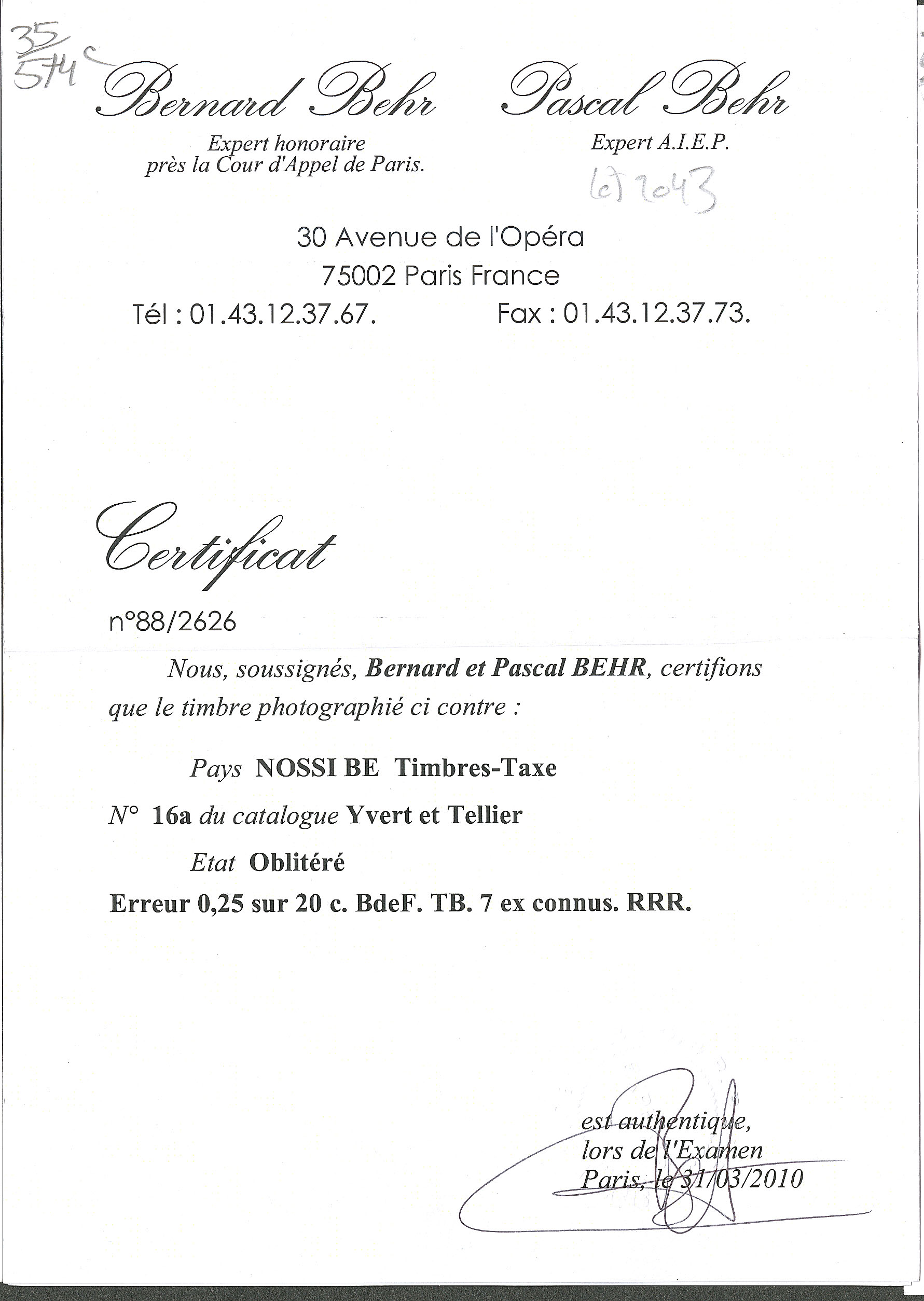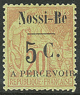 | 2043 | NOSSI-BE.Taxe. Erreur "0.25" (au lieu d "0.15") sur 20c brique sur vert. No 16a, bdf, superbe. - RRR (qqs ex connus) (cote Yvert) | 1 | 47250€ | 19500€ | - |