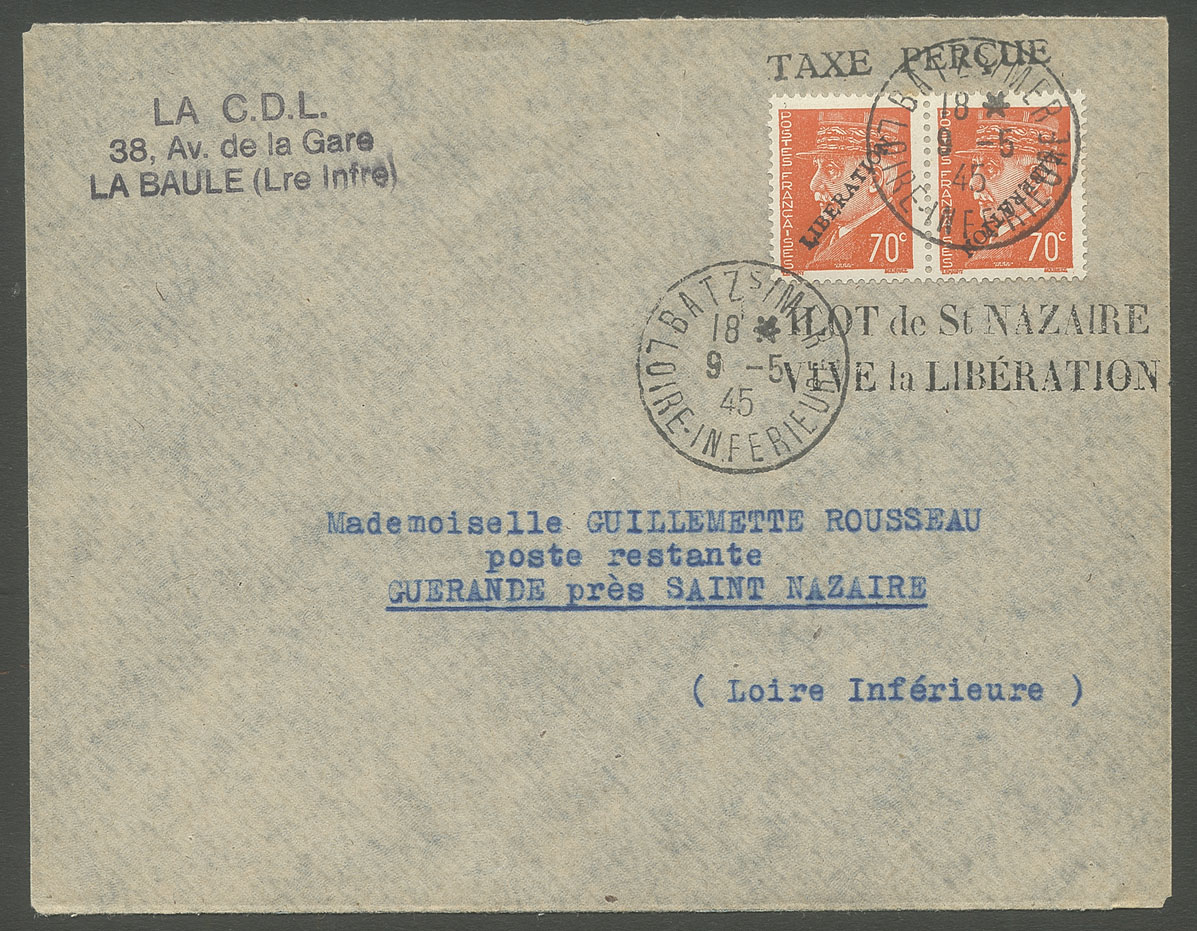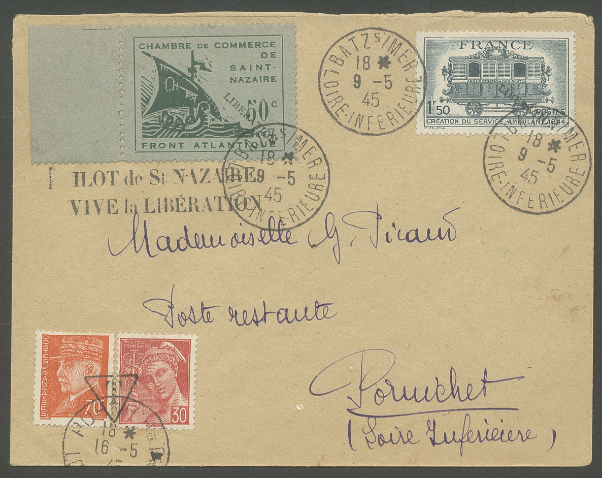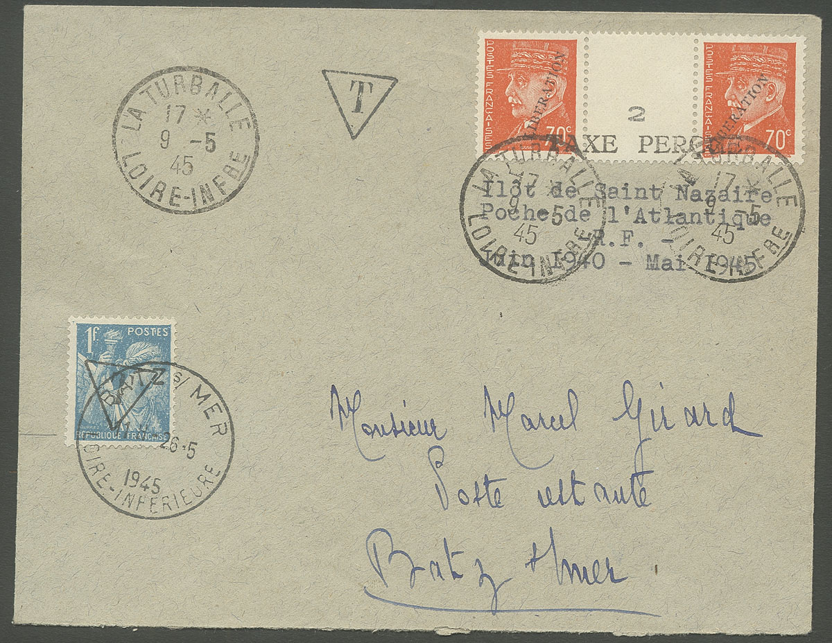 1806 | Surchargés LIBERATION. Nos 8 + Poste 609 sur �7 de Batz 9.5.45 pour Pornichet taxée par Poste 412 + 511. - TB | —€ | 150 € | - | ||