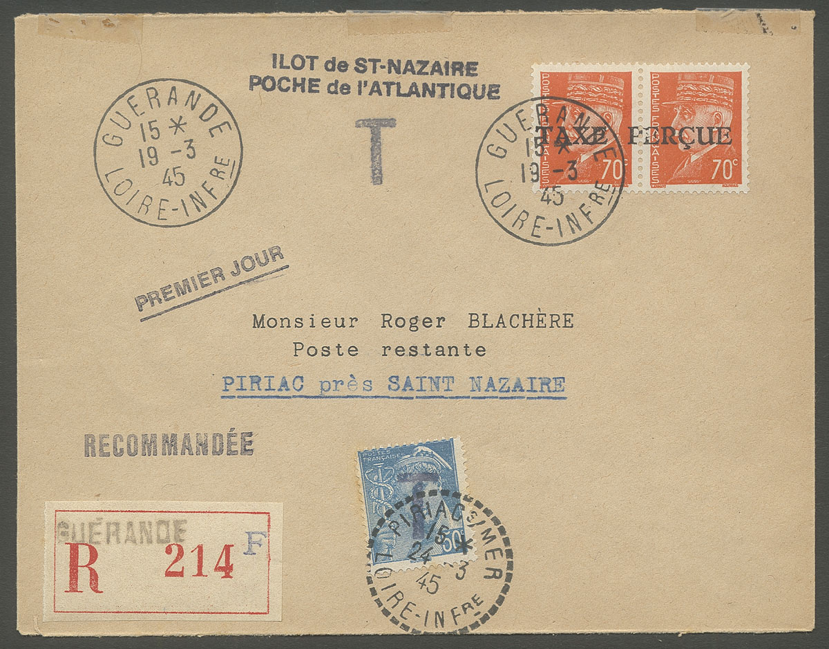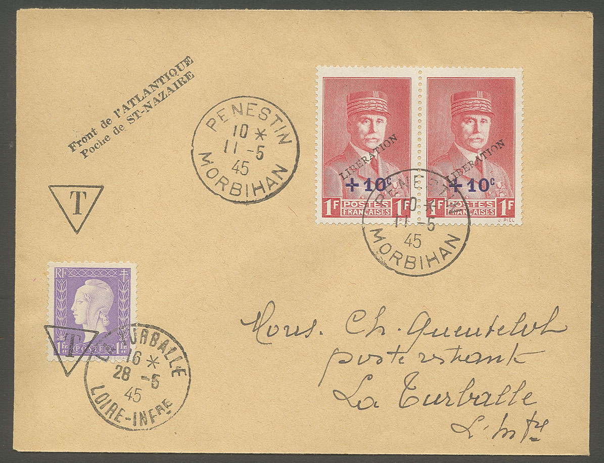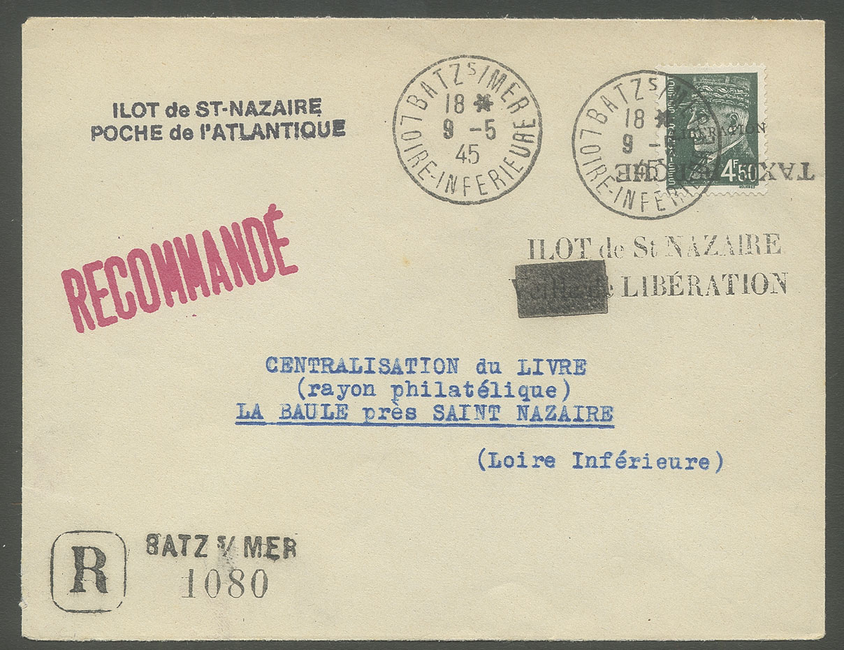 1806 | Surchargés LIBERATION. Nos 8 + Poste 609 sur �7 de Batz 9.5.45 pour Pornichet taxée par Poste 412 + 511. - TB | —€ | 150 € | - | ||