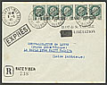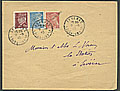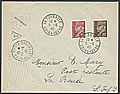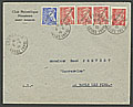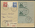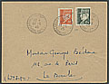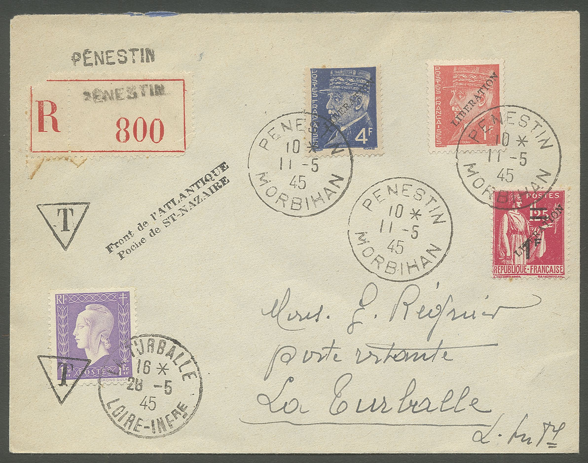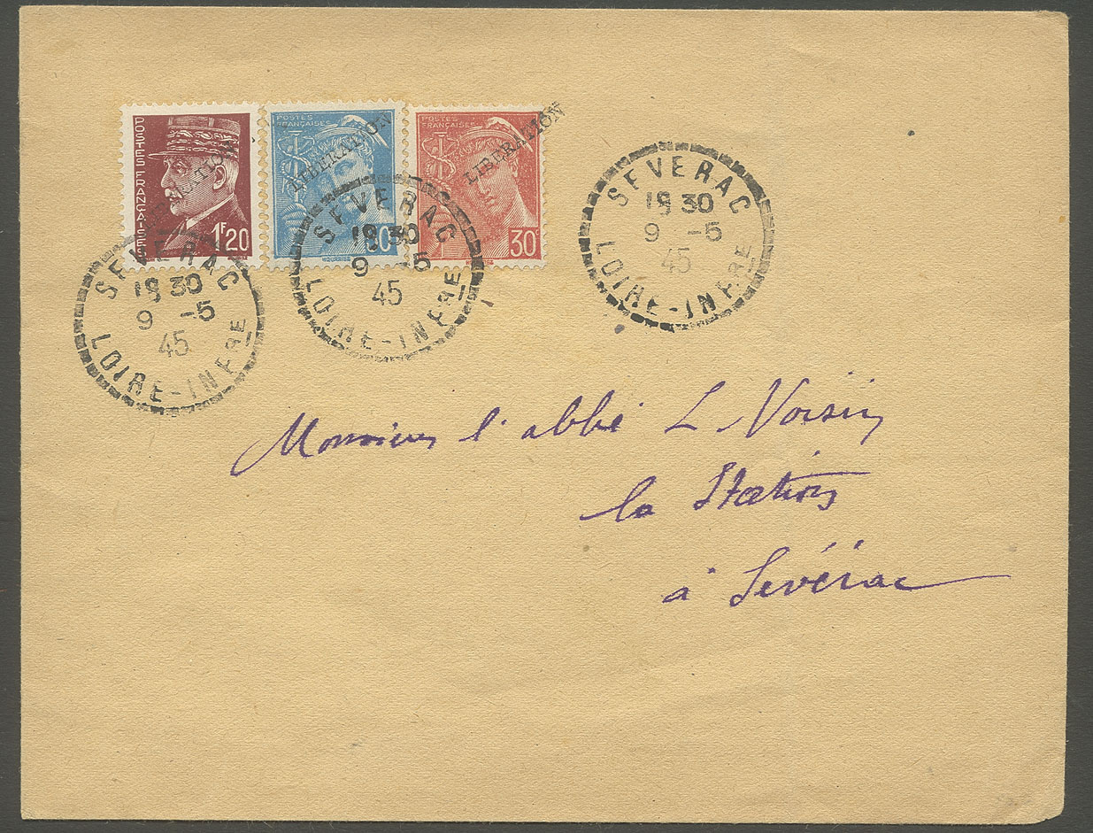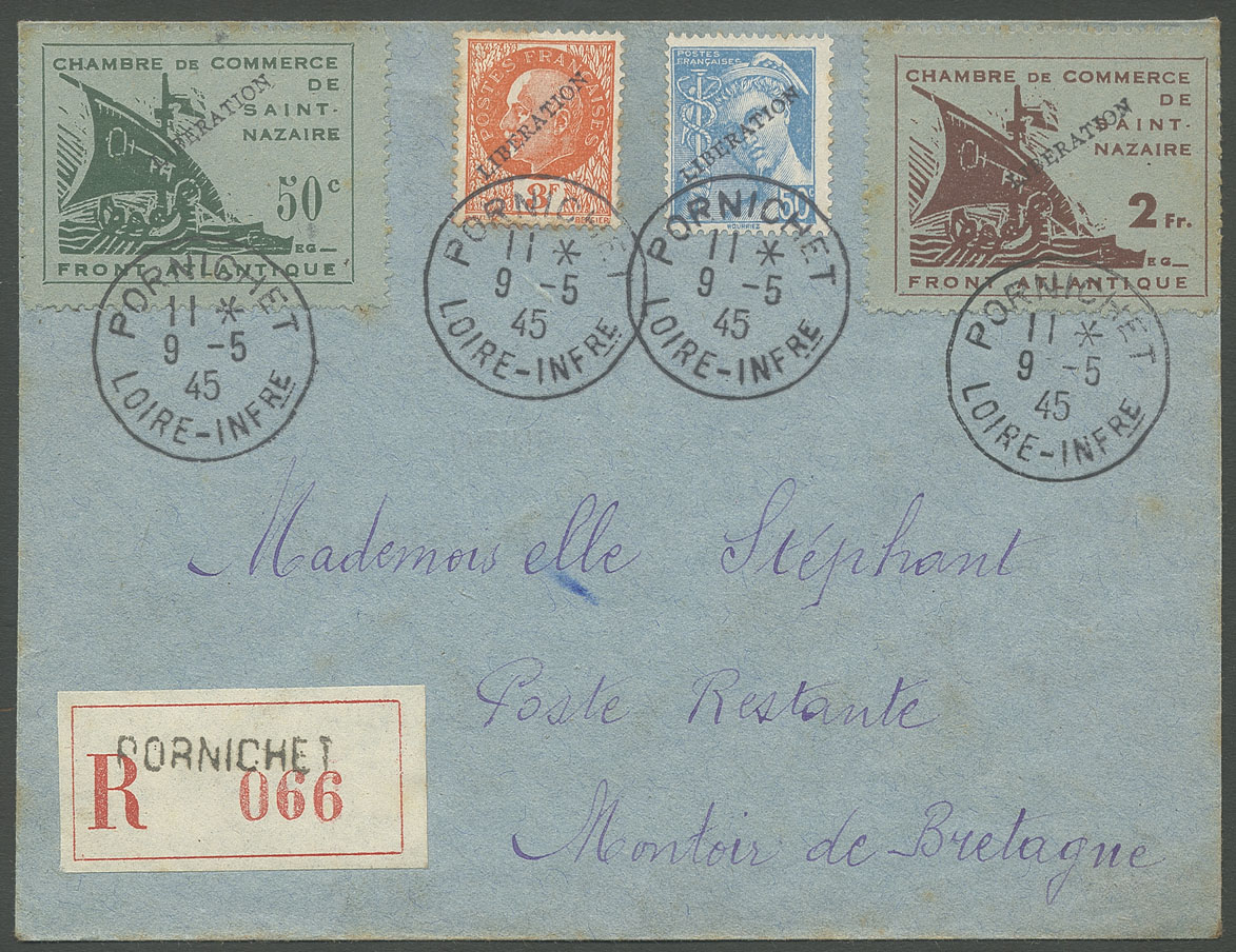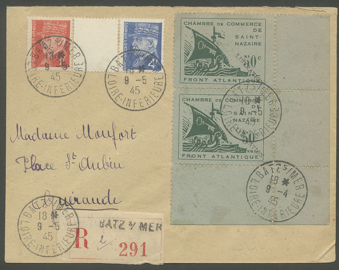 1811 | — Nos 8 + 9 + Poste 521 + 538, sur �7 recomm. de Pornichet 9.5.45, sans arr., rousseurs sinon TB | —€ | 120 € | - | ||