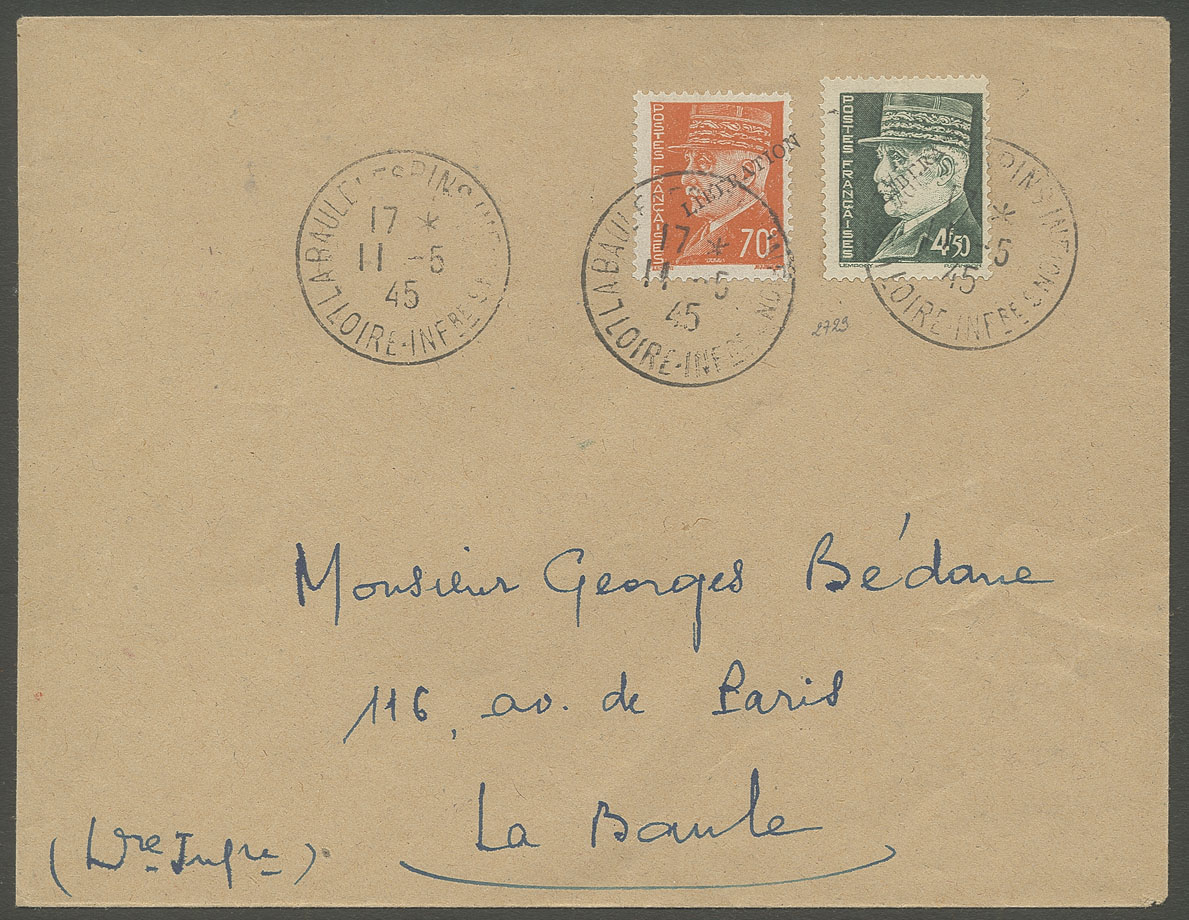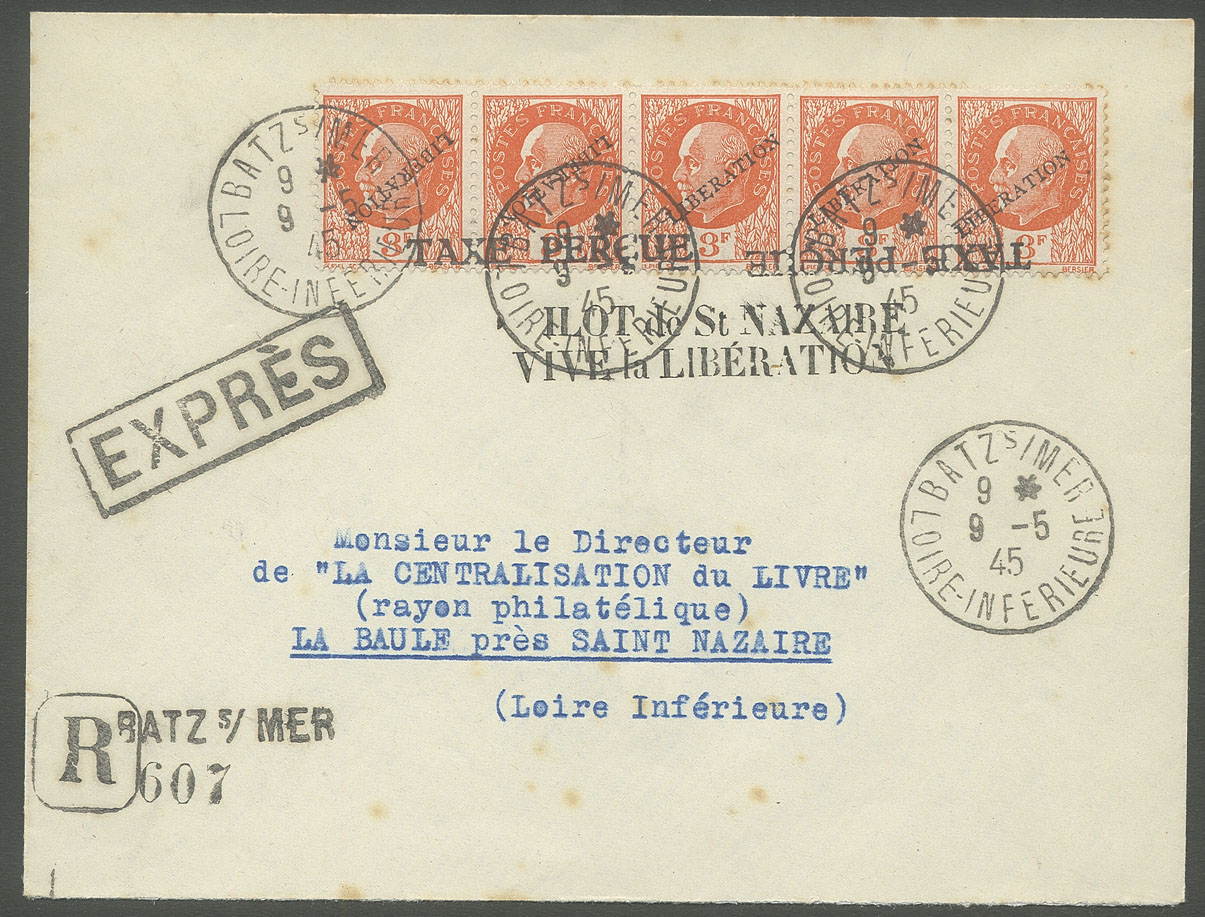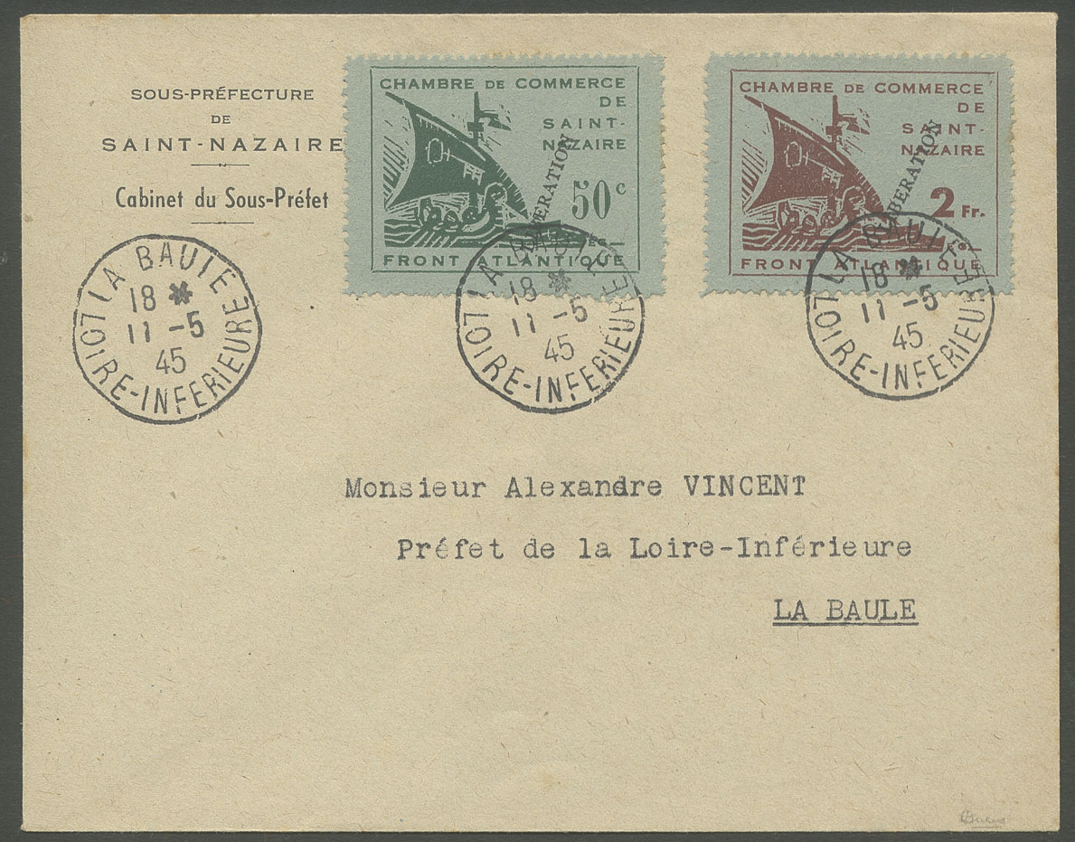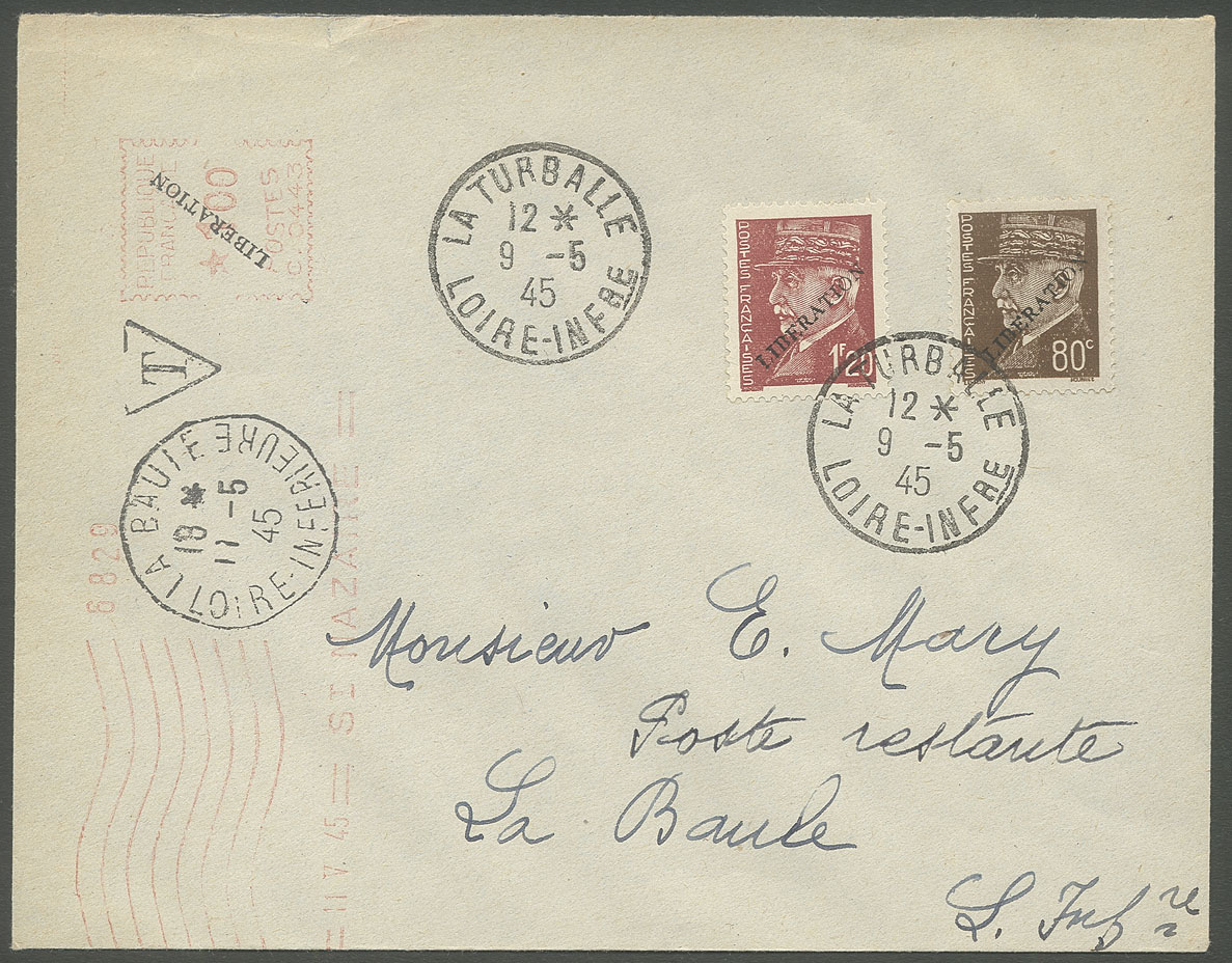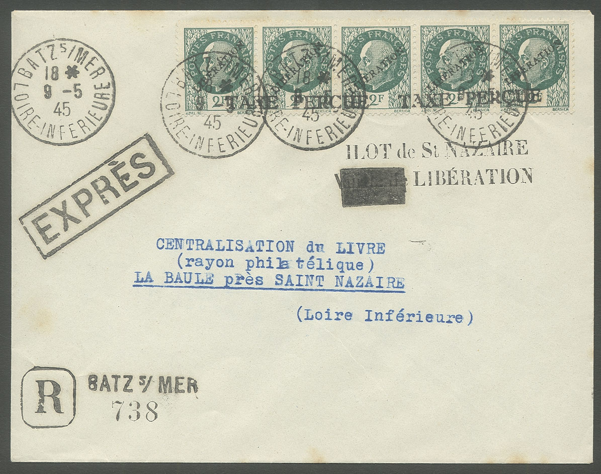 1814 | — Sur �7 afft Poste 511 surch. LIBERATION, obl cad Batz 9.5.45, pour Guérande avec arr. - TB | —€ | 90 € | - | ||