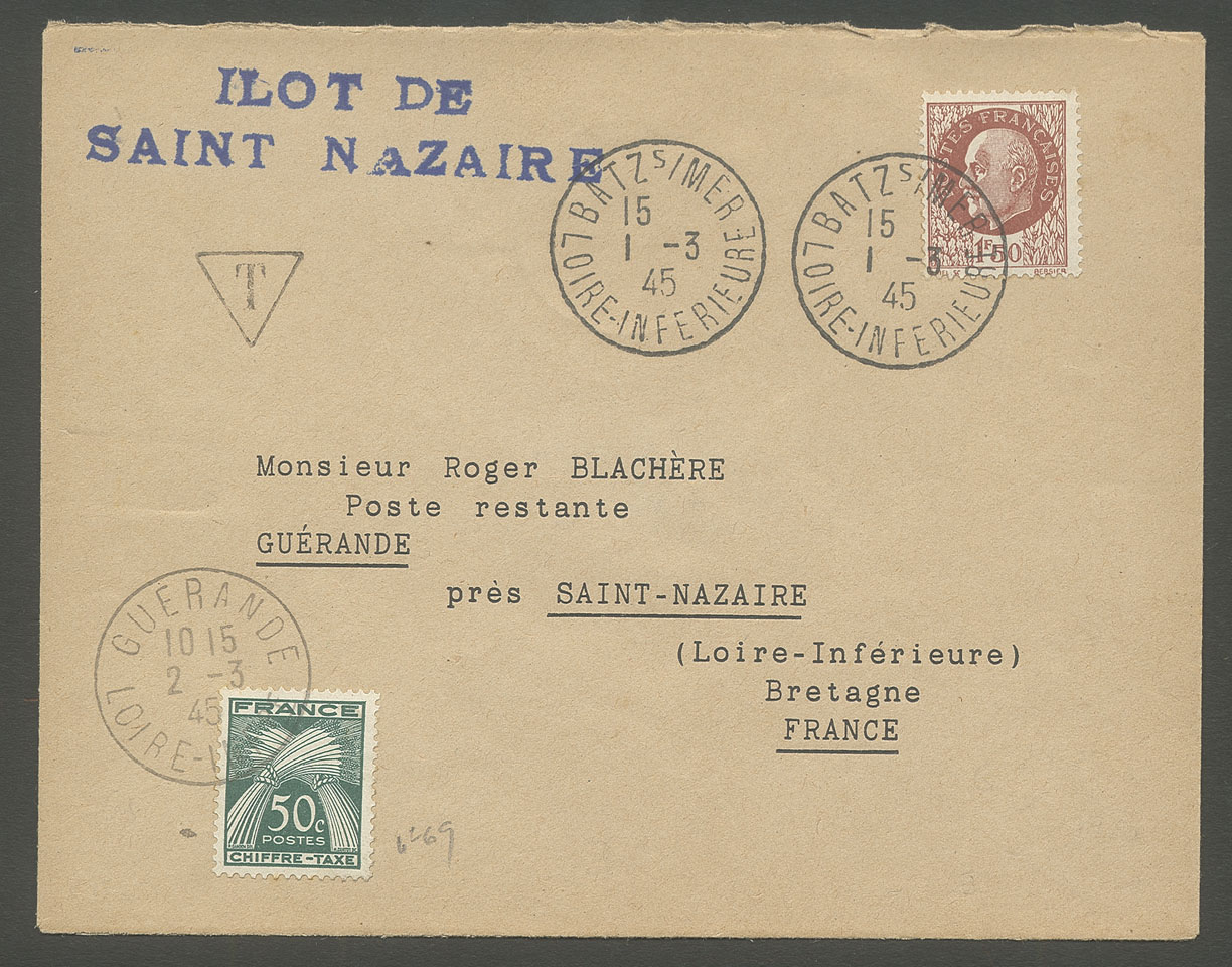 1812 | Griffe Ilot de/Saint Nazaire, sur �7 afft Poste 517 obl Batz 1.3.45 + Taxe 88 obl Guérande 2.3.45. - TB | —€ | 30 € | - | ||