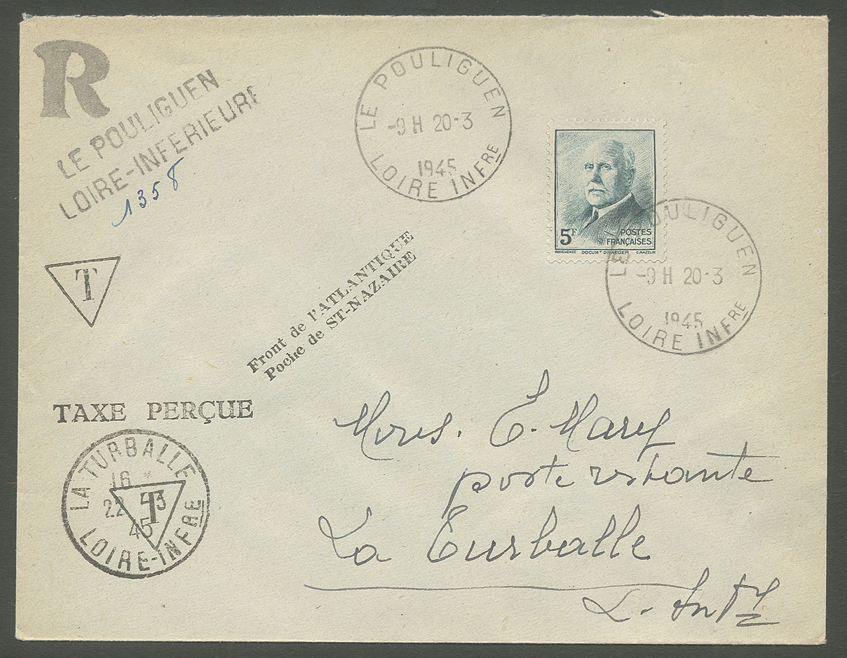 1813 | Griffe TAXE PERCUE. Sur �7 afft Poste 524, obl Le Pouliguen 20.3.45, recomm. pour La Turballe. - TB | —€ | 50 € | - | ||