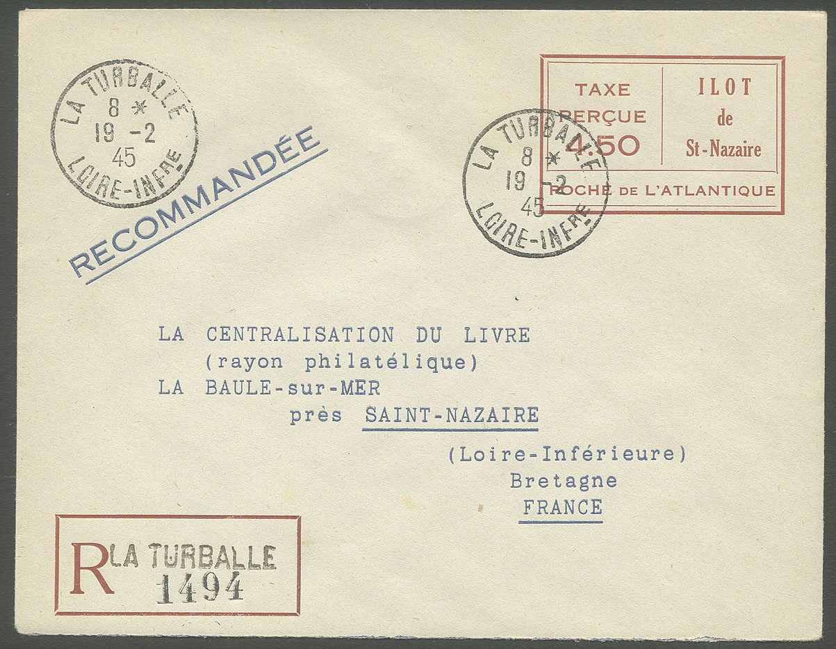 1821 | Entier postal TAXE/PERCUE/4.50, recommandé de La Turballe 19.2.45 pour La Baule avec arr. - TB | —€ | 50 € | - | ||