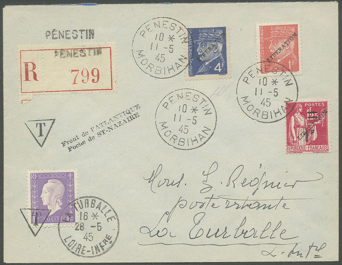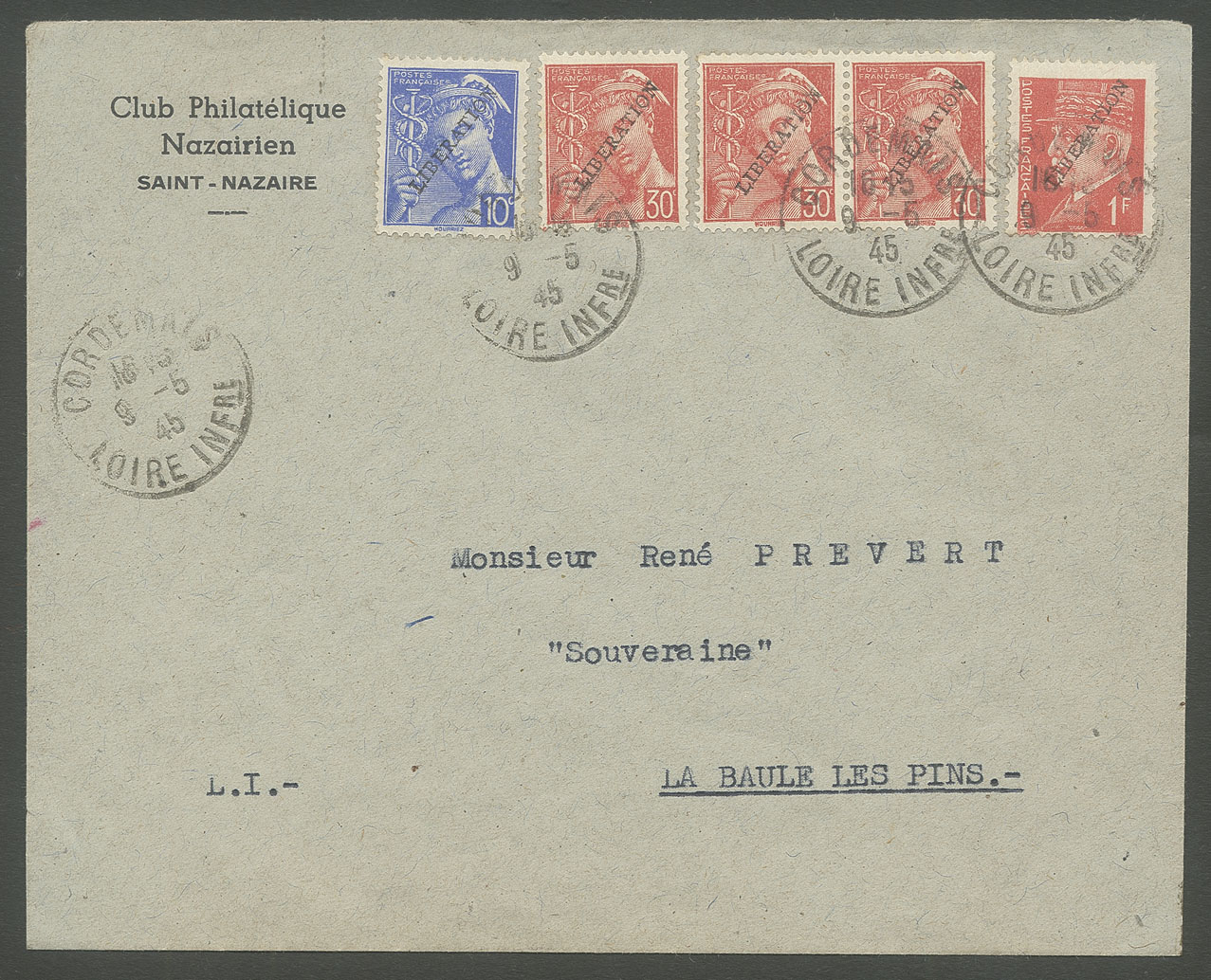 1822 | Surchargés LIBERATION. Poste N°407 + 412(3) + 514, obl Cordemais 9.5.45 sur �7 pour La Baule. - TB | —€ | 100 € | - | ||