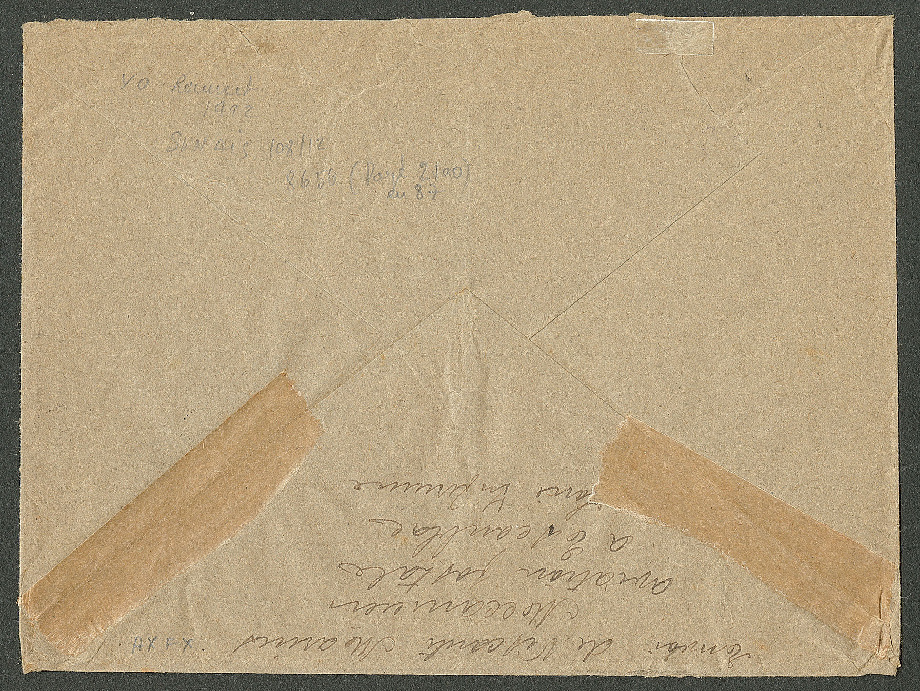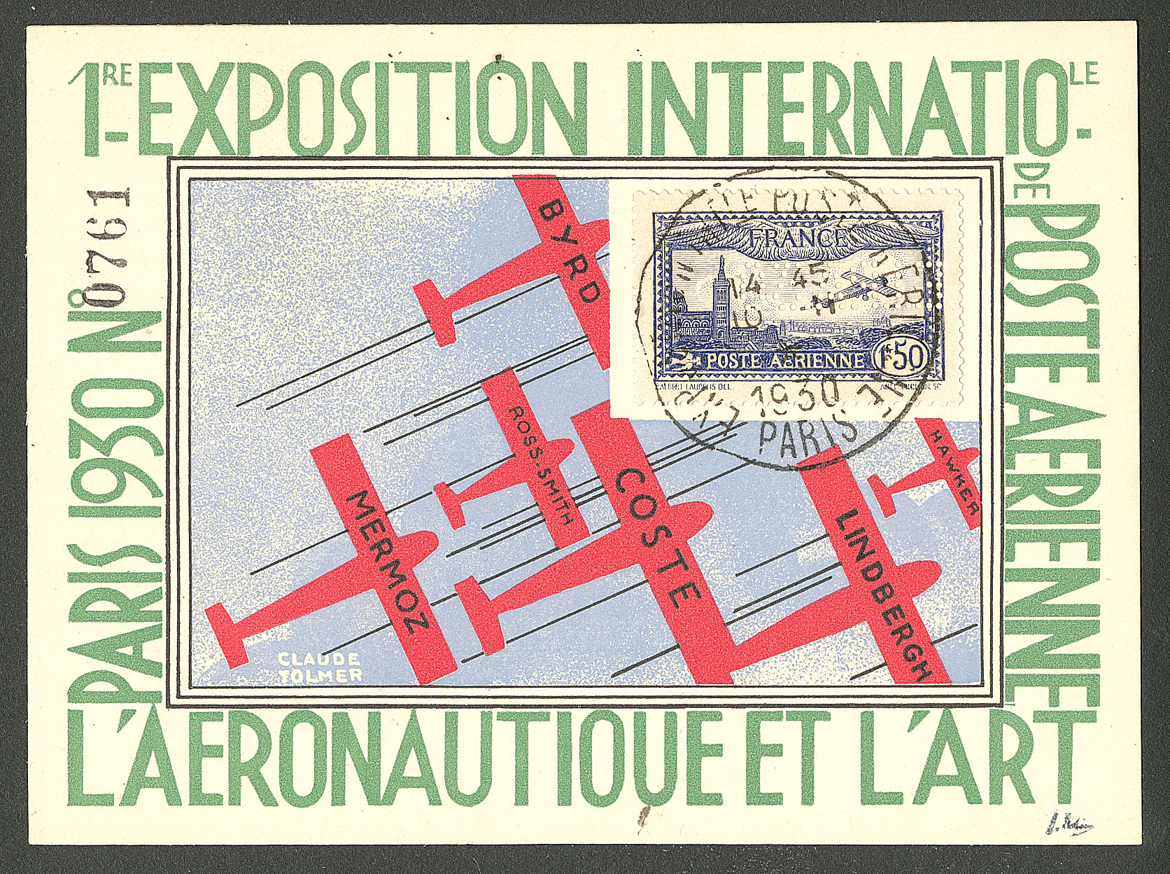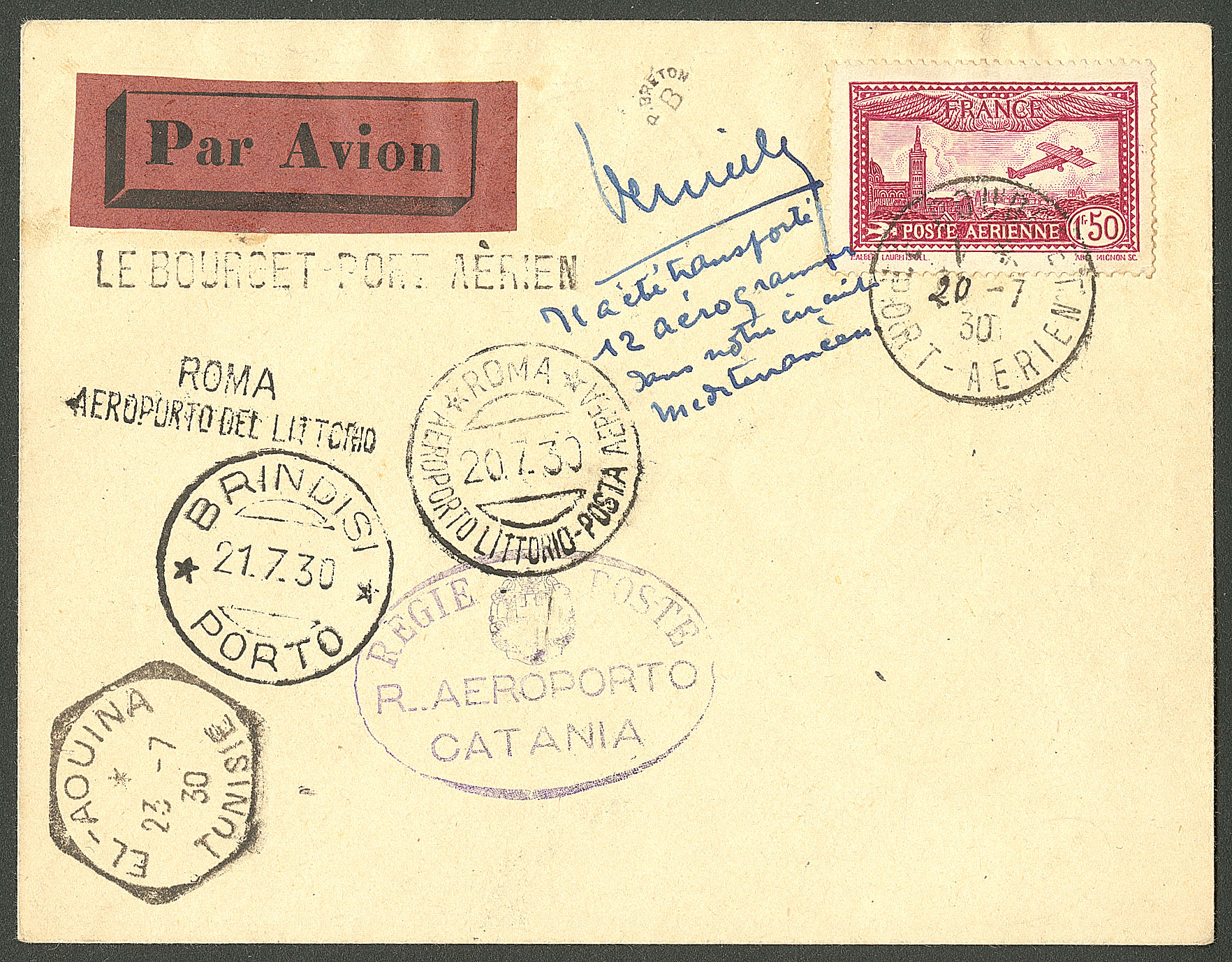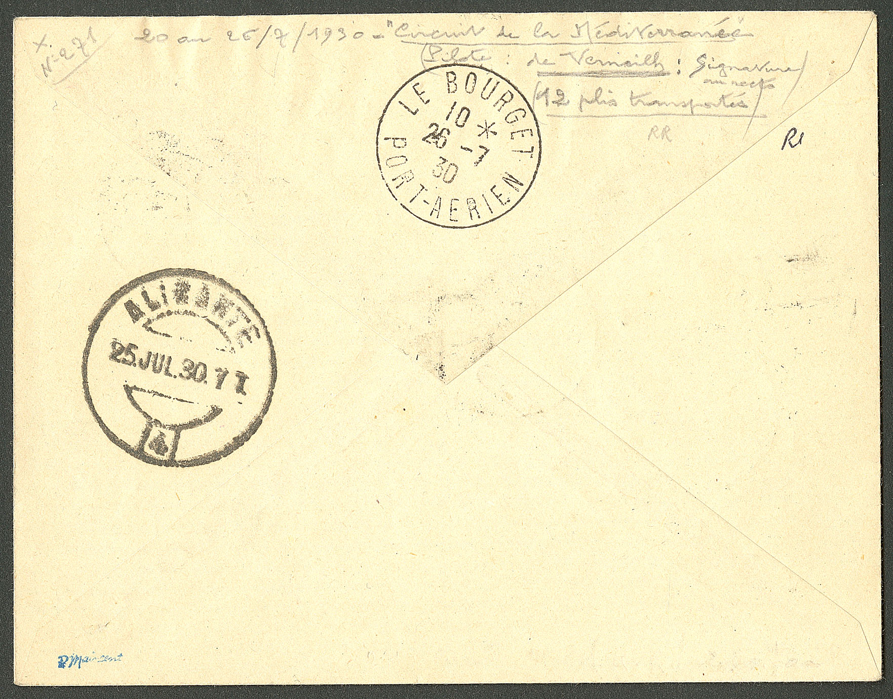 942 | POSTE AERIENNE. Lettre.20.7.1930. Tour de la Méditerranée par de Verneilh. enveloppe afft PA 5, avec cad des 5 escales et divers CS, retour Le Bourget 26.7.30, avec mention manuscrite et signature de Verneilh, superbe. - RR (12 plis) | 1 | - | 900€ | vendu 900€ | |