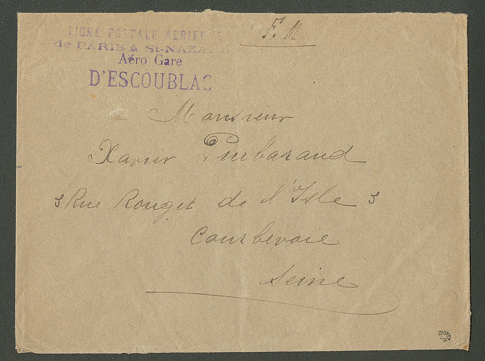 938 | POSTE AERIENNE. Lettre.Paris-St Nazaire 17 août 1918. Griffe violette Aérogare d'Escoublac sur enveloppe en FM de Viscanti Marins (mécanicien). - TB | - | 220€ | vendu 348€ | ||