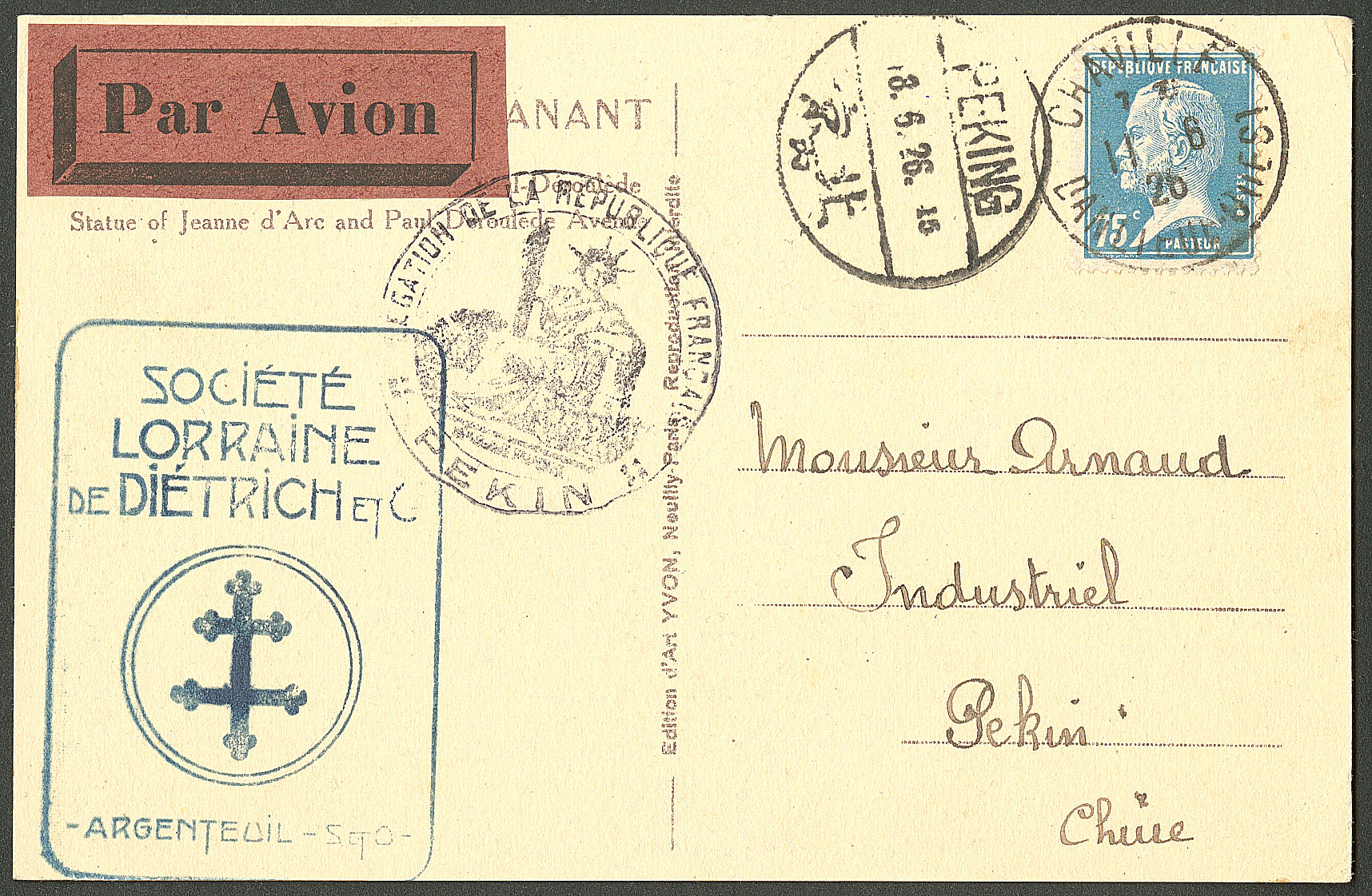 939 | POSTE AERIENNE. Lettre.Grands raids. Paris-Pekin. CP afft N°177 obl cad Chaville 11.6.26, arr. Pekin 18.6, CS de la délégation et Sté Lorraine-de Dietrich. - TB. - R (25 plis) | 1 | - | 700€ | vendu 852€ | |