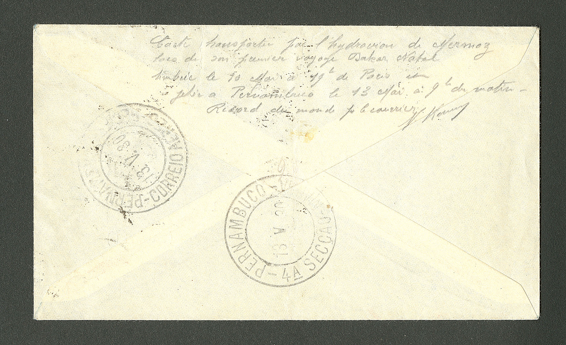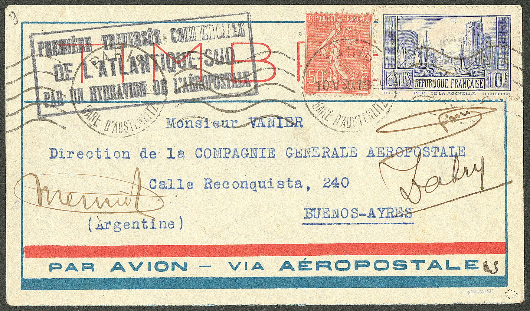 940 | POSTE AERIENNE. Lettre.Ligne Mermoz. 1re traversée commerciale Atlantique Sud par hydravion de l'Aéropostale. enveloppe Vanier, afft 199 + 261b obl 10 V 30, arr. Rio 13 mai 30, avec signatures des trois pilotes dont Mermoz. - TB. - R | 3 | - | 800€ | vendu 1943€ | |