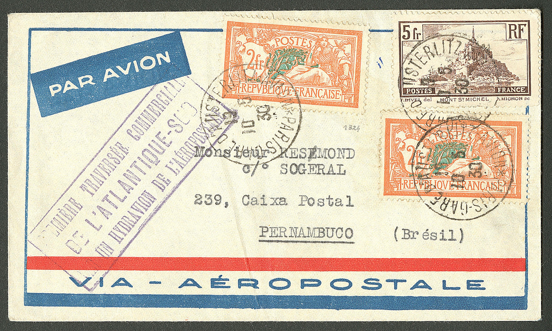 941 | POSTE AERIENNE. Lettre.Ligne Mermoz. 1re traversée commerciale Atlantique Sud par hydravion de l'Aéropostale. enveloppe afft 145(2) + 260, obl 10.5.30, arr. Pernambuco 13.5, avec grand CS rectangulaire. - TB | 3 | - | 200€ | vendu 200€ | |