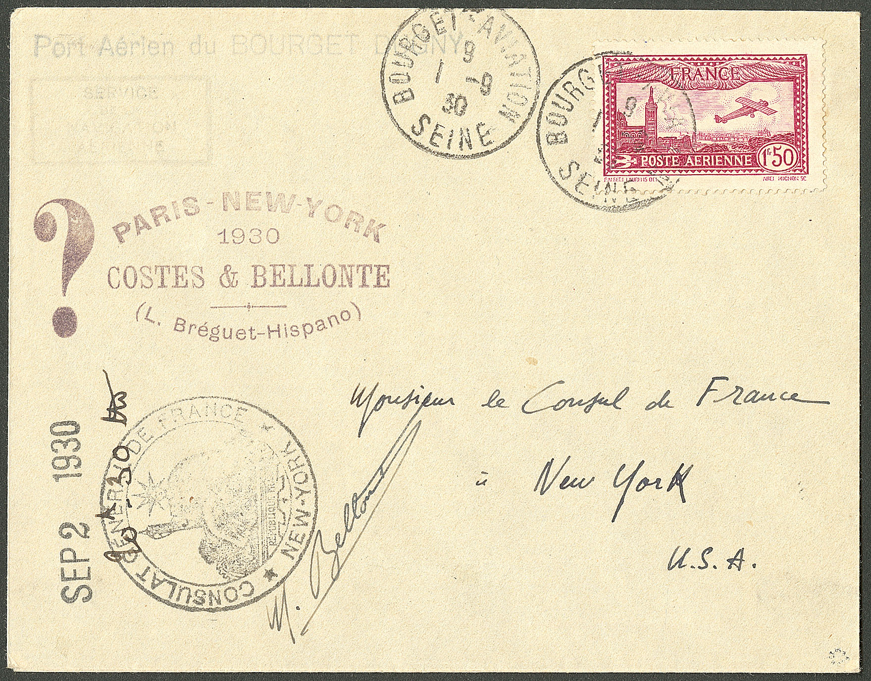 943 | POSTE AERIENNE. Lettre.1er Vol Paris-New York sans escale par Costes et Bellonte. enveloppe témoin de Bellonte, signée, afft PA 5 obl 1.9.30 avec CS, pour le consul de France à NY, arr. 2 sept, superbe. - RR | 1 | - | 1300€ | vendu 2125€ | |