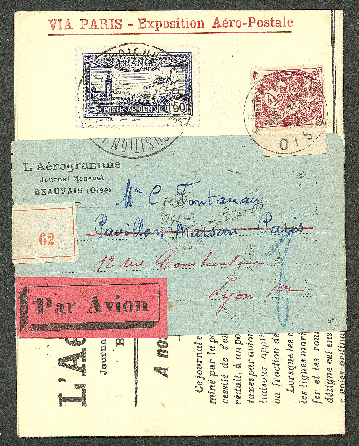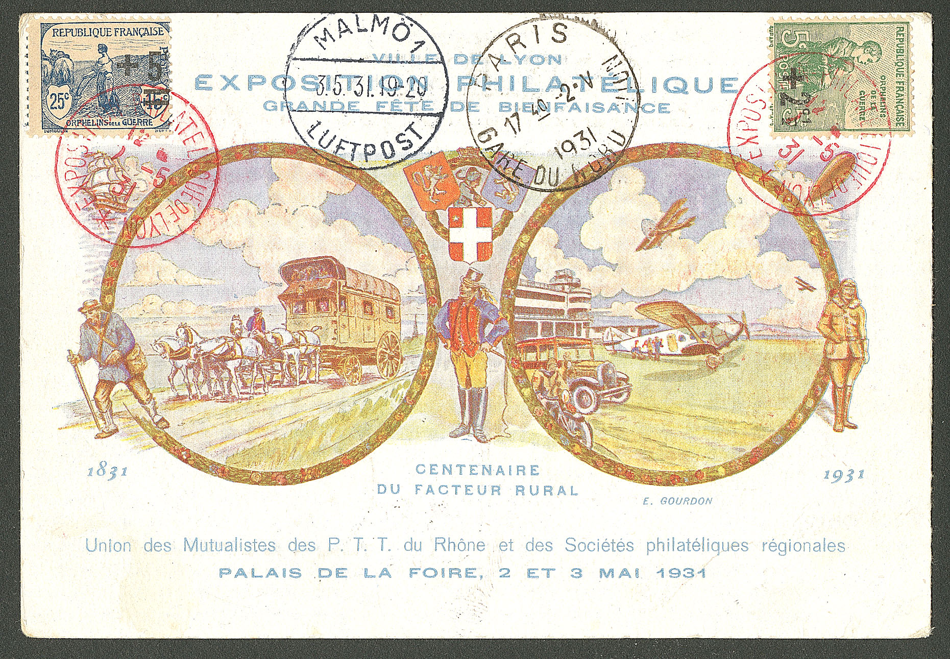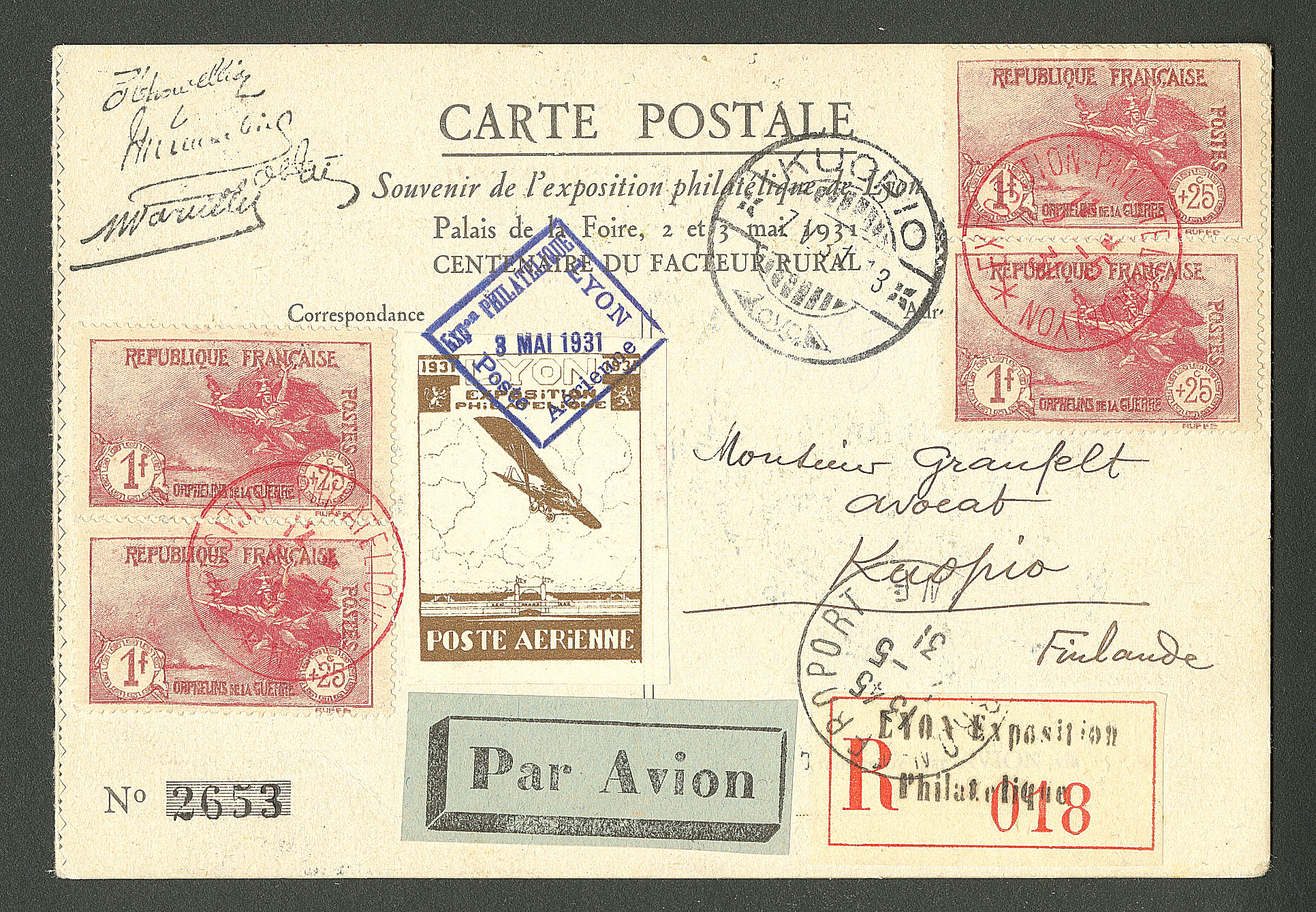 944 | POSTE AERIENNE. Lettre.Exposition philatélique Lyon 1931. CTS illustrée afft Poste 163 + 165 + 231 (4) obl cad rouge 2.5.31, + VS, recommandée pour Kuopio (Finlande) via Malmö. - TB | 7 | - | 100€ | vendu 113€ | |