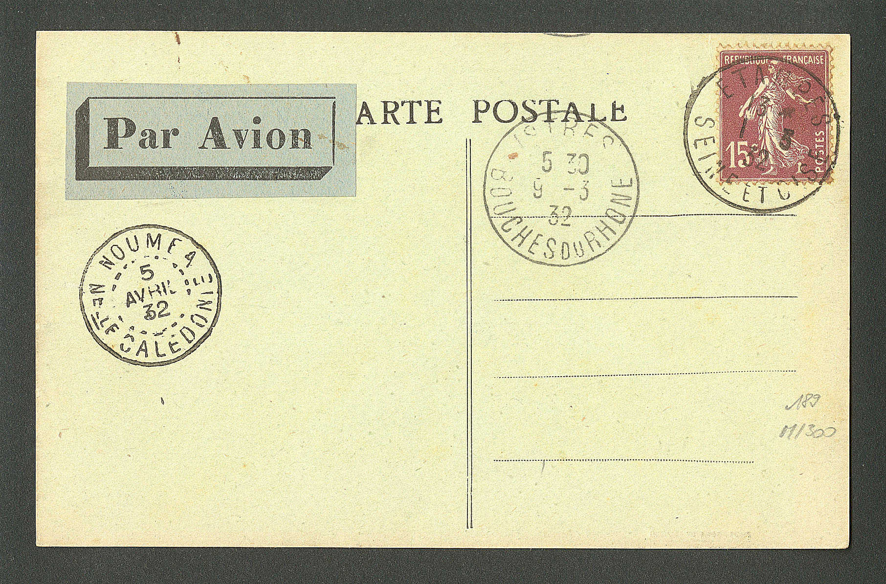 945 | POSTE AERIENNE. Lettre.1re liaison aérienne France-Nelle Calédonie. CP afft 189 obl Istres 9.3.32, arr. Nouméa 5.4.32 et cachet bleu. - TB | 1 | - | 80€ | vendu 80€ | |