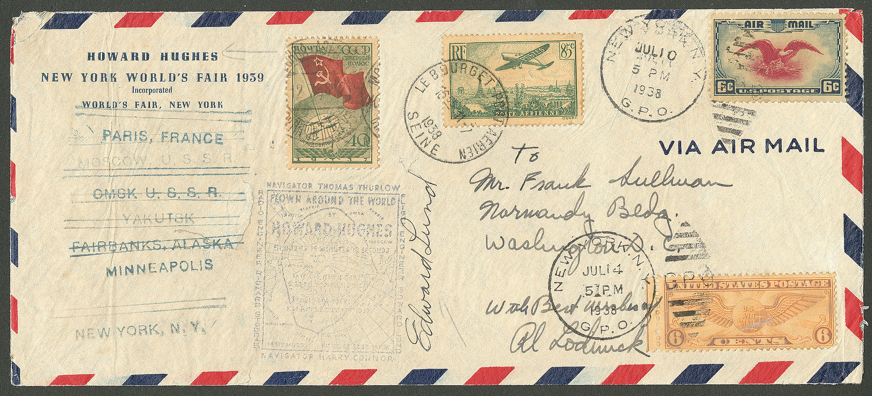 946 | POSTE AERIENNE. Lettre.Grands raids. Vol record autour du monde par Howard Hugues. 10 juil 1938. enveloppe afft mixte France + USA + URSS, avec CS et griffes des villes escales + signature Edward Lund. - TB. - R (qqs plis connus) | 4 | - | 500€ | vendu 867€ | |