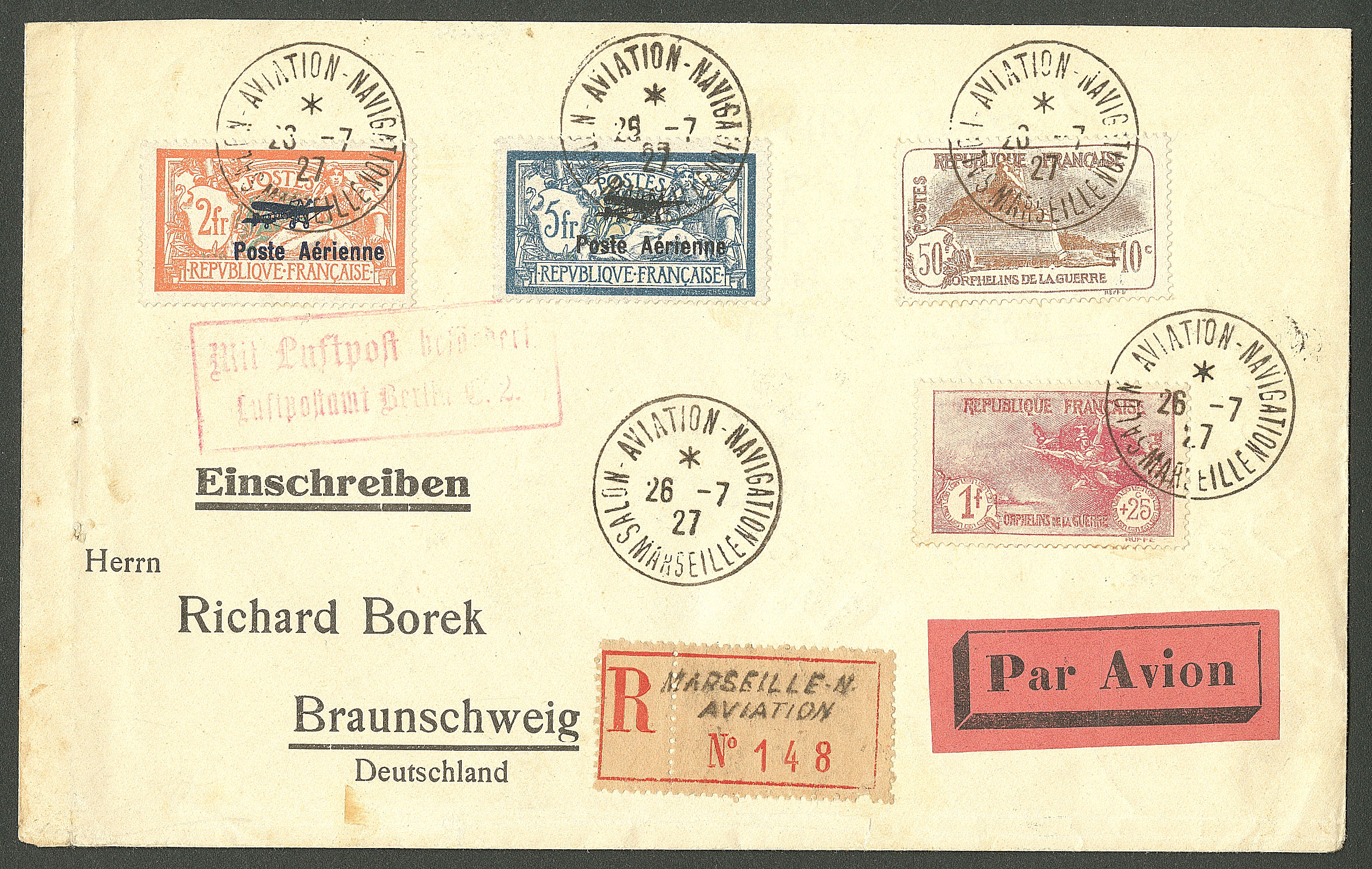 954 | POSTE AERIENNE. Lettre.Nos 1 + 2 + Poste 230 + 231, obl 26.7.27 sur enveloppe recommandée pour l'Allemagne. - TB | 4 | - | 120€ | vendu 134€ | |