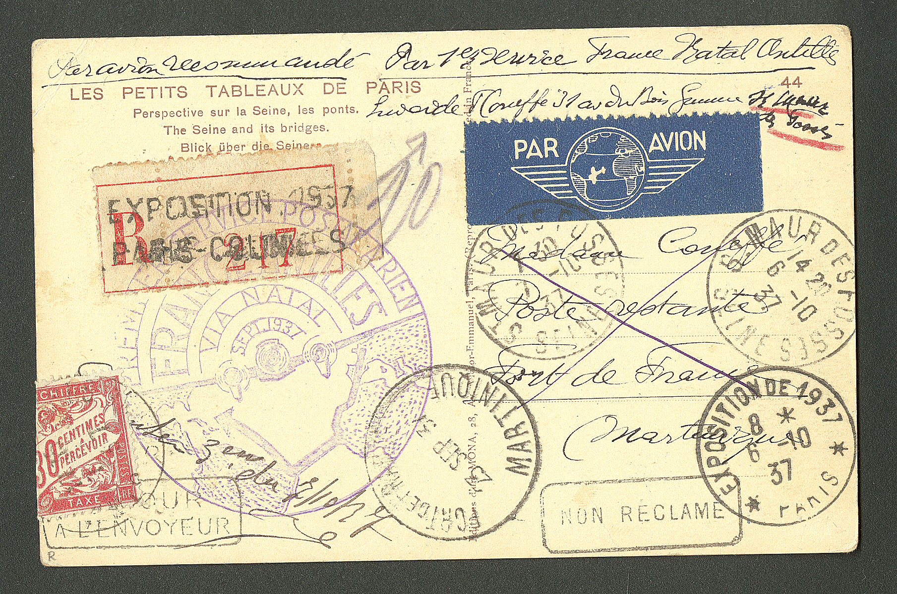 975 | POSTE AERIENNE. Lettre.1er Vol France-Antilles via Natal sept 1937. Nos 8 + 10 à 13 sur CP recommandée de l'Expo 6.10.37 pour Fort de France avec CS violet, retournée à l'expéditeur et taxée (N°33). - TB | 6 | - | 100€ | vendu 116€ | |
