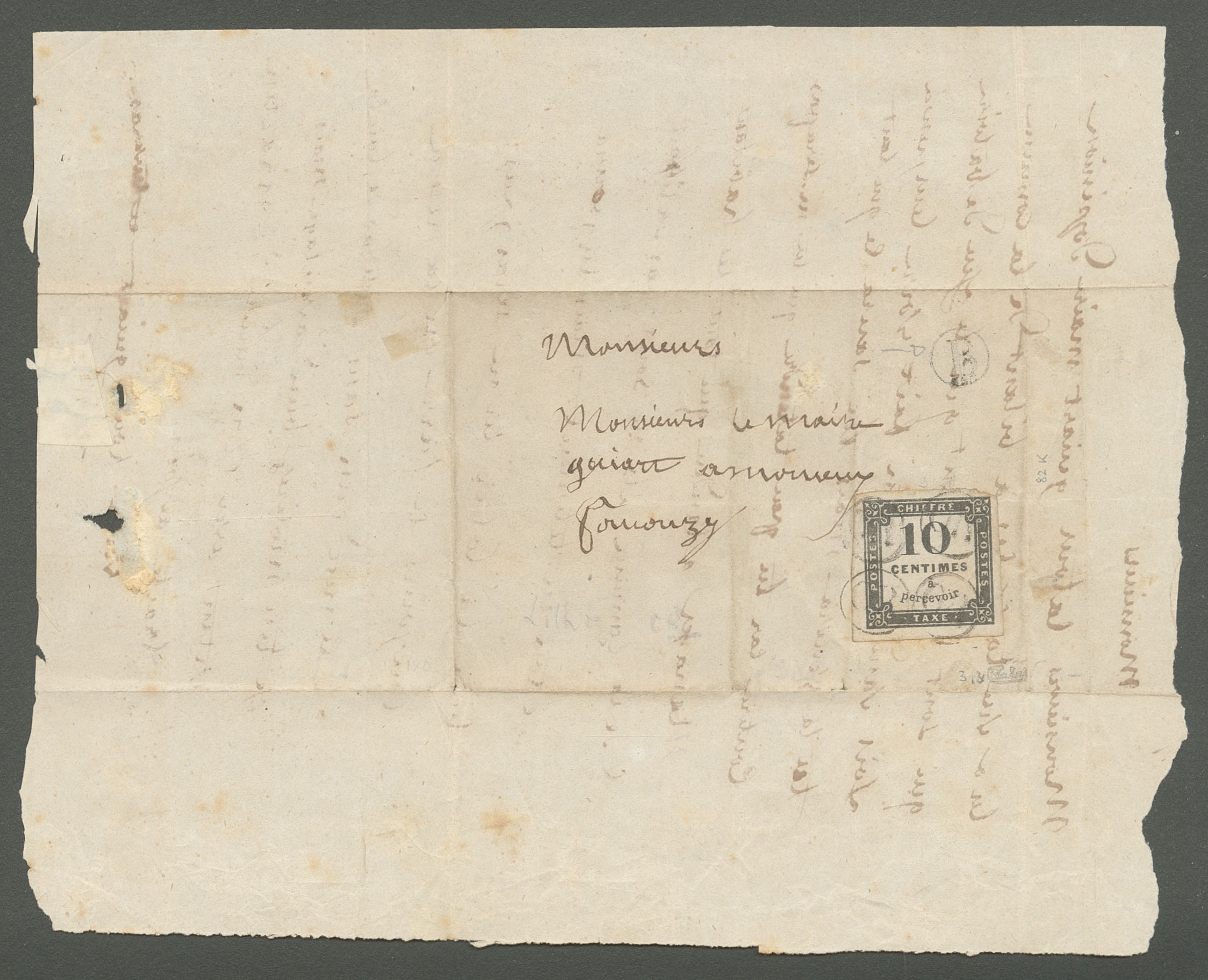 | 1125 | TAXE. Piquage de Clamecy. No 3, obl Clamecy sur support. - TB (cote SM) | 1 | 800€ | 150€ | vendu 150€ | ||
