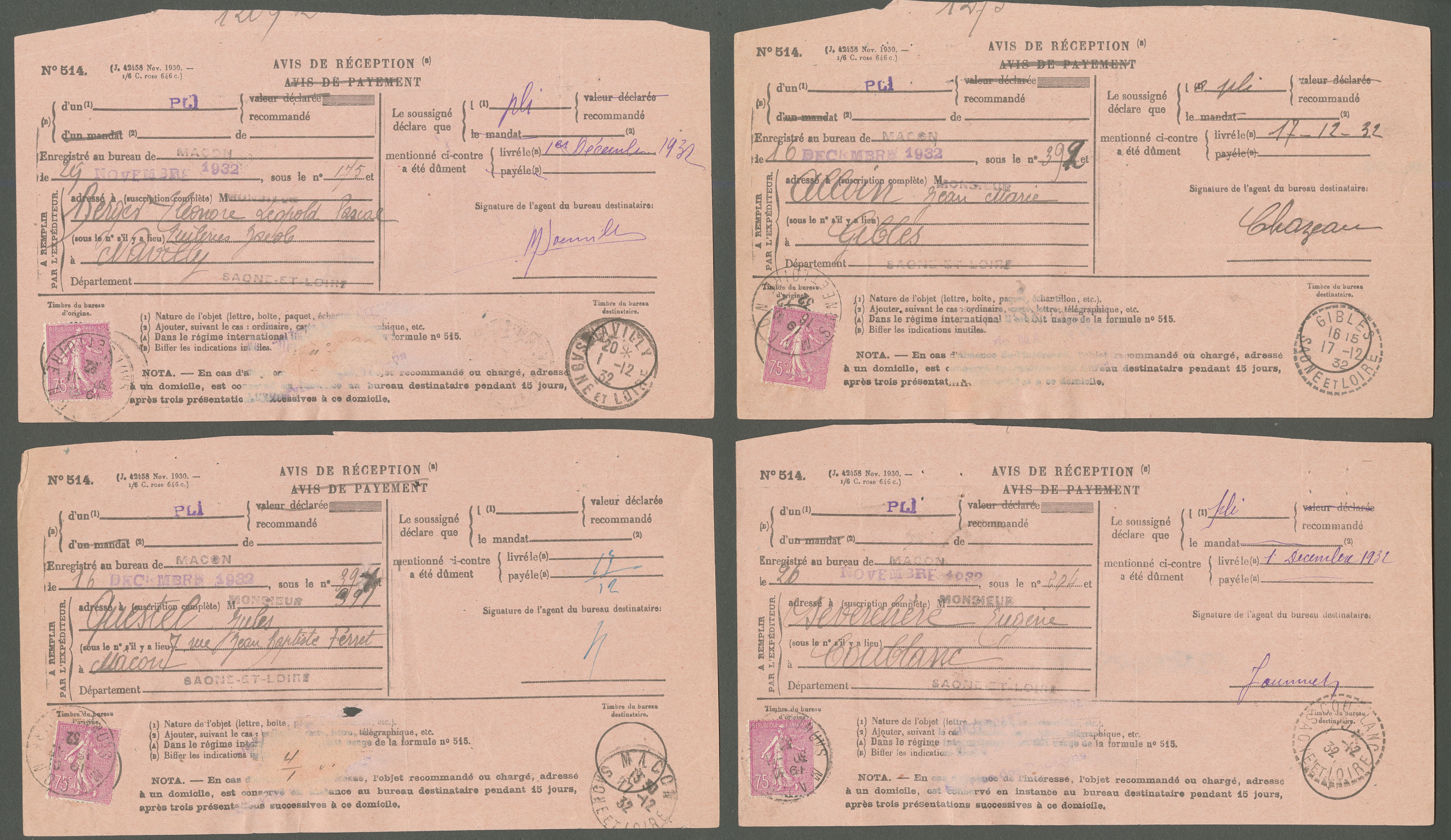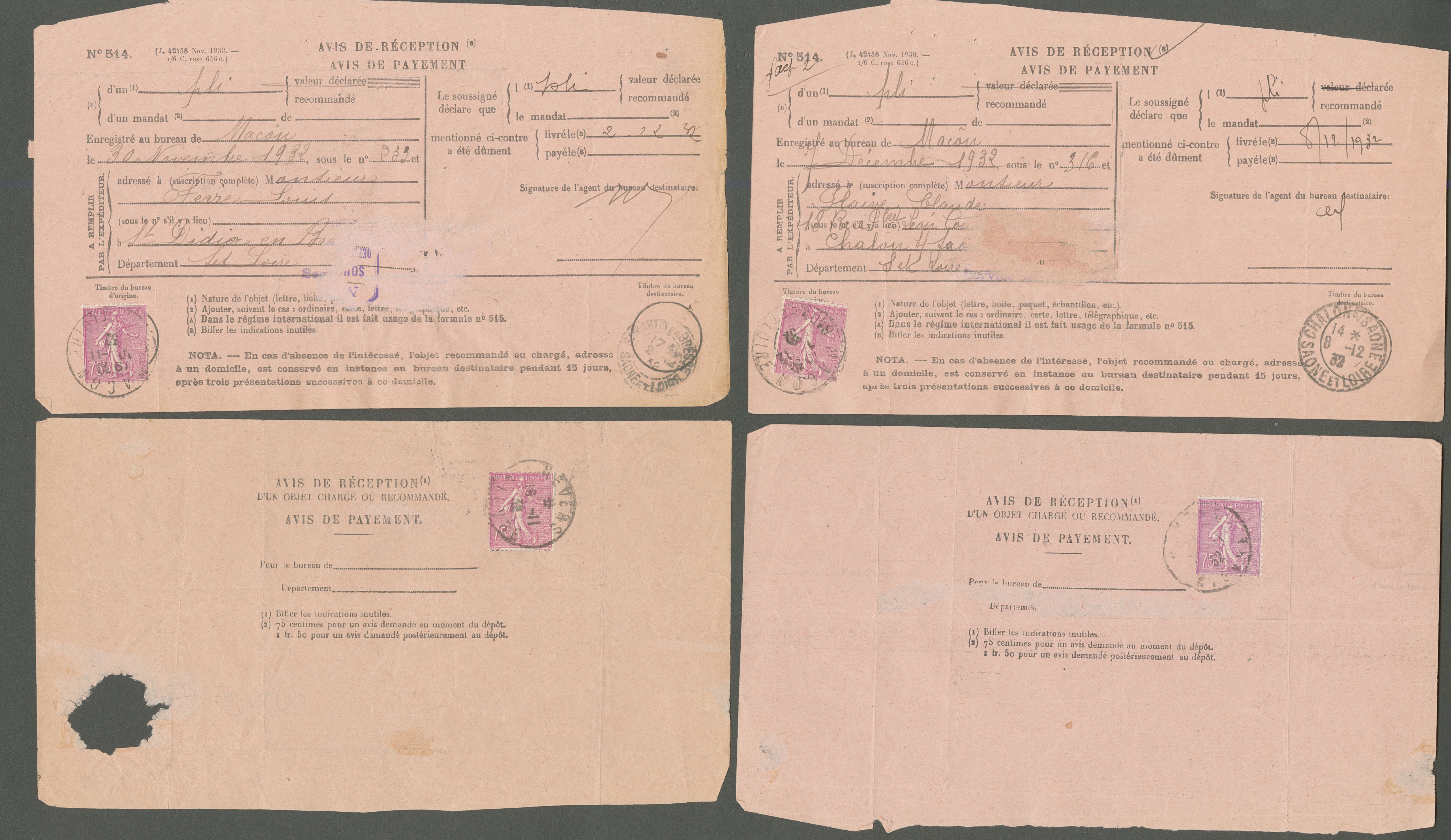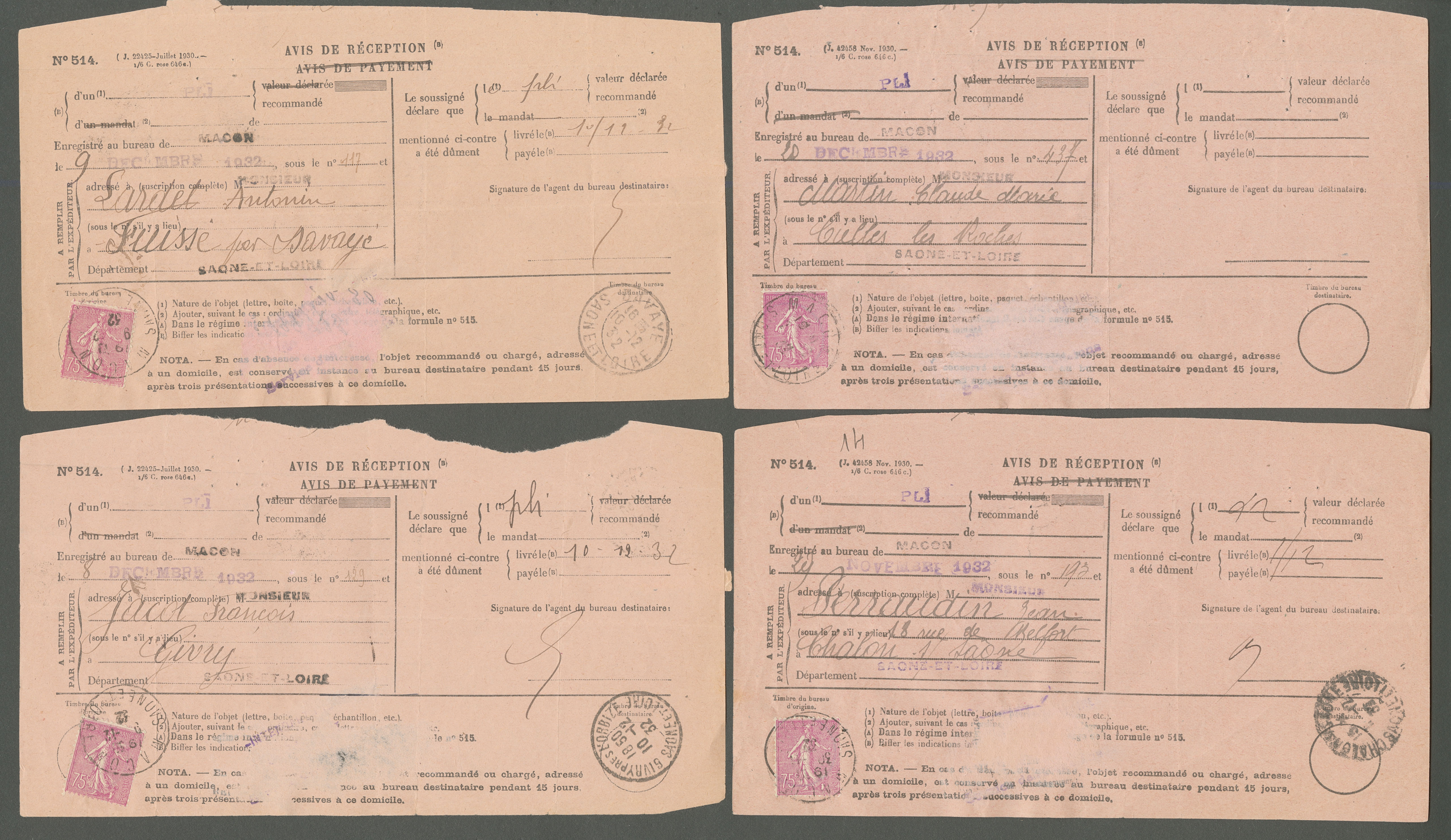 | 881 | XXe SIECLE. Type II. No 202a (27), sur avis de réception, tous du département de Saône et Loire, avec N°514. - TB (cote Yvert) | - | - | 500€ | vendu 586€ | ||
