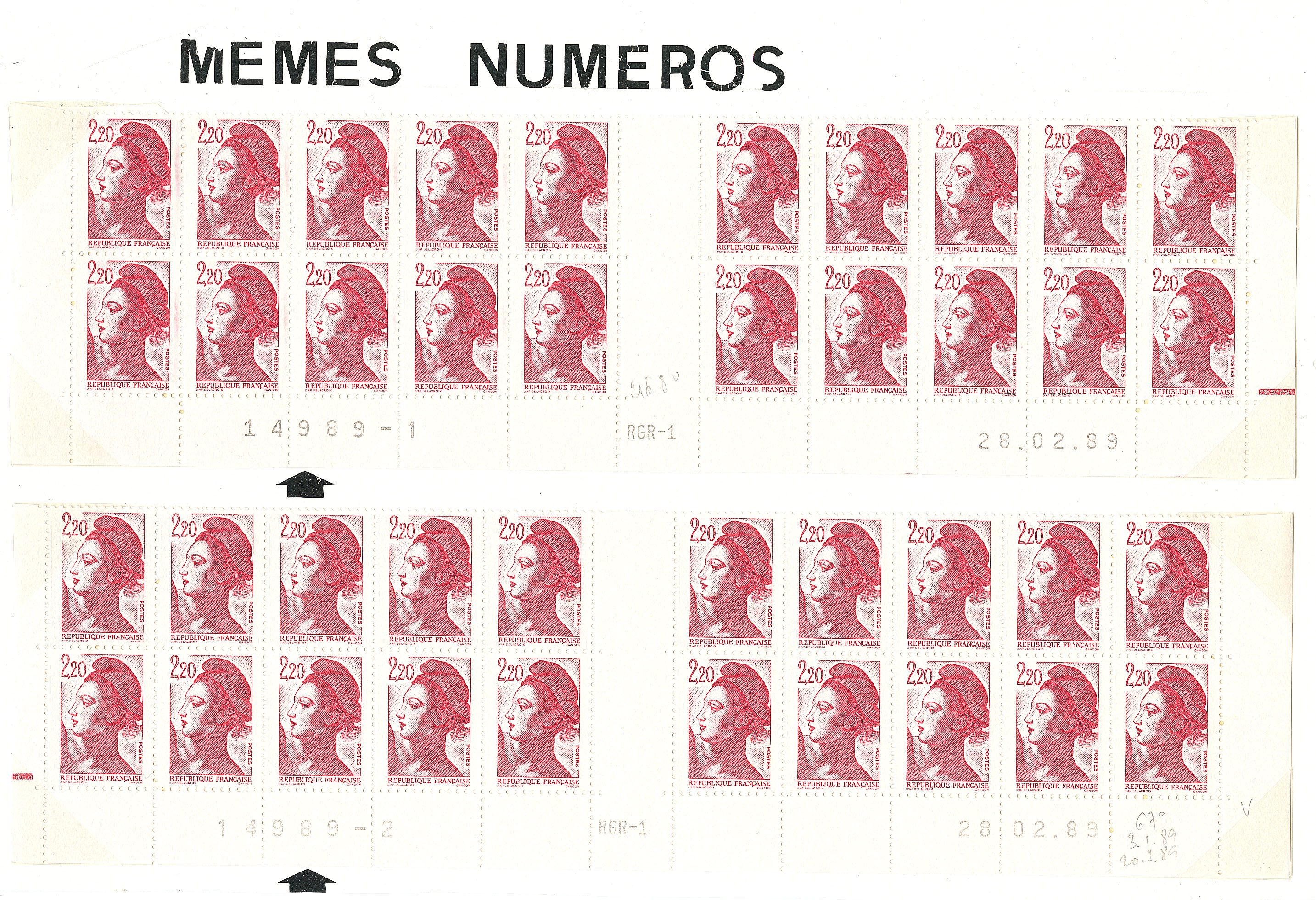 | ** | 1014 | XXe SIECLE ** Feuilles jumelles. No 2376, 2 bas de feuilles de 20ex avec numéros 14989-1" et "14989-2" et même date 28.02.89. - TB. - R" | 40 | - | 400€ | - | |