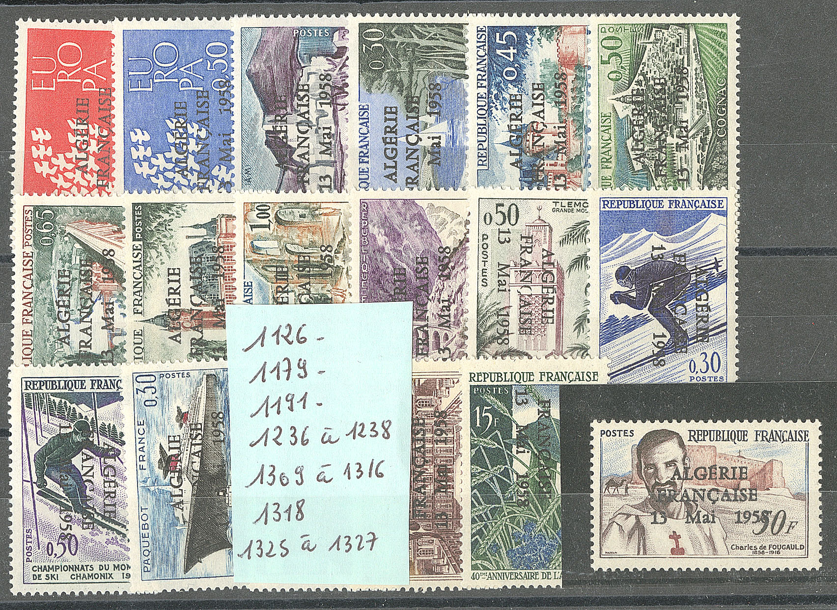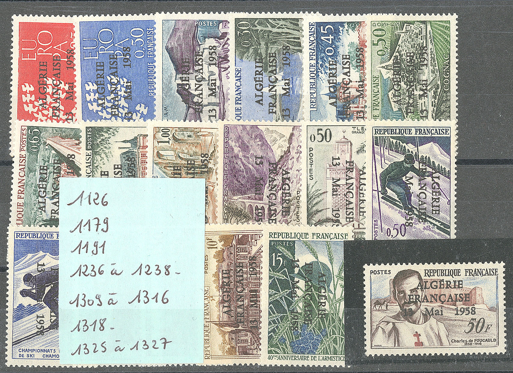 | ** | 1515 | ALGERIE. ** 1re surcharge "Algérie française 13 Mai 1958. 21ex Poste et 5ex Service. - TB | 26 | - | 500€ | vendu 599€ | |