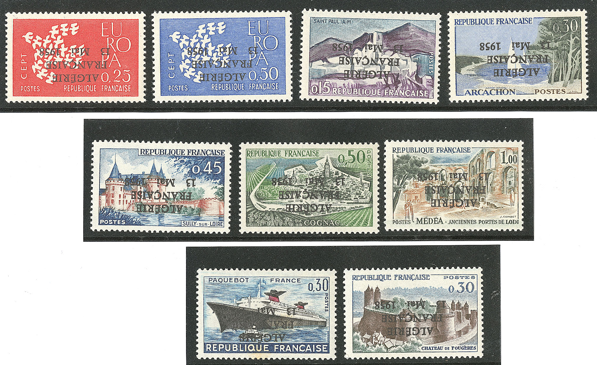 | ** | 1520 | ALGERIE. ** 2e surcharge "Algérie française 13 Mai 1958. Surcharge renversée. Nos 1236, 1309 à 1314, 1318 et 1325. - TB | 9 | - | 200€ | vendu 440€ | |