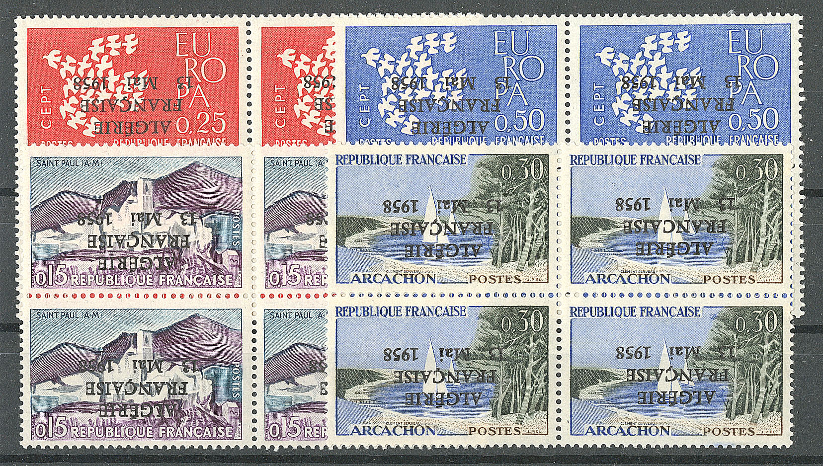| ** | 1518 | ALGERIE. ** 2e surcharge "Algérie française 13 Mai 1958. 14ex Poste entre les N°1237 et 1326, tous en bloc de quatre. - TB | 56 | - | 300€ | vendu 338€ | |