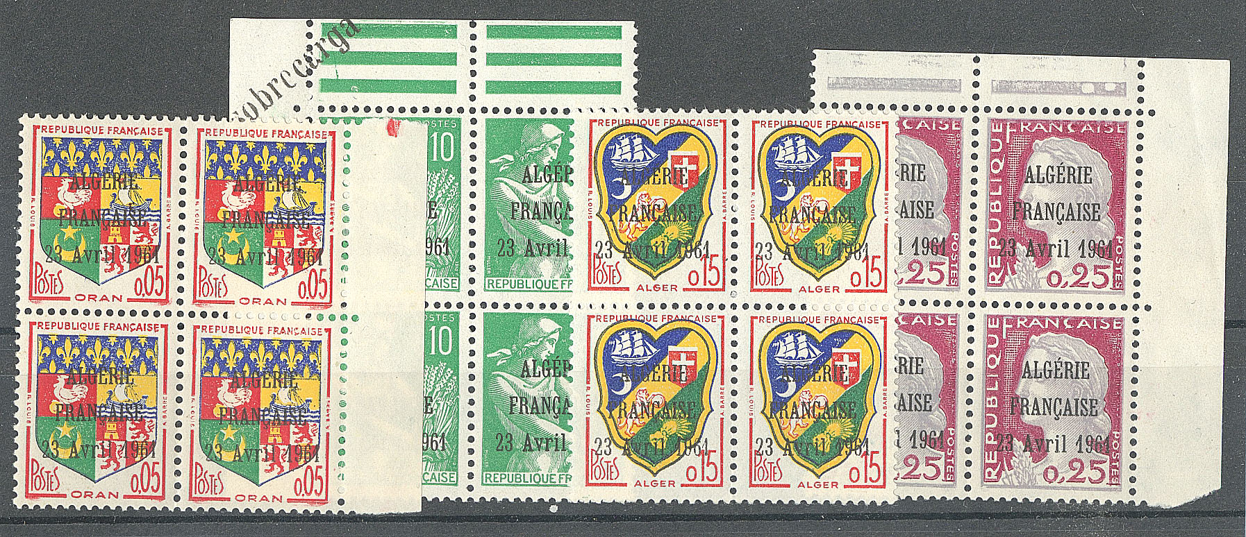 | ** | 1523 | ALGERIE. ** Surcharge "Algérie française 23 Avril 1961" pour le putsch d'Alger. Nos 1230A à 1232 et 1263, tous en bloc de quatre. - TB | 16 | - | 150€ | vendu 369€ | |
