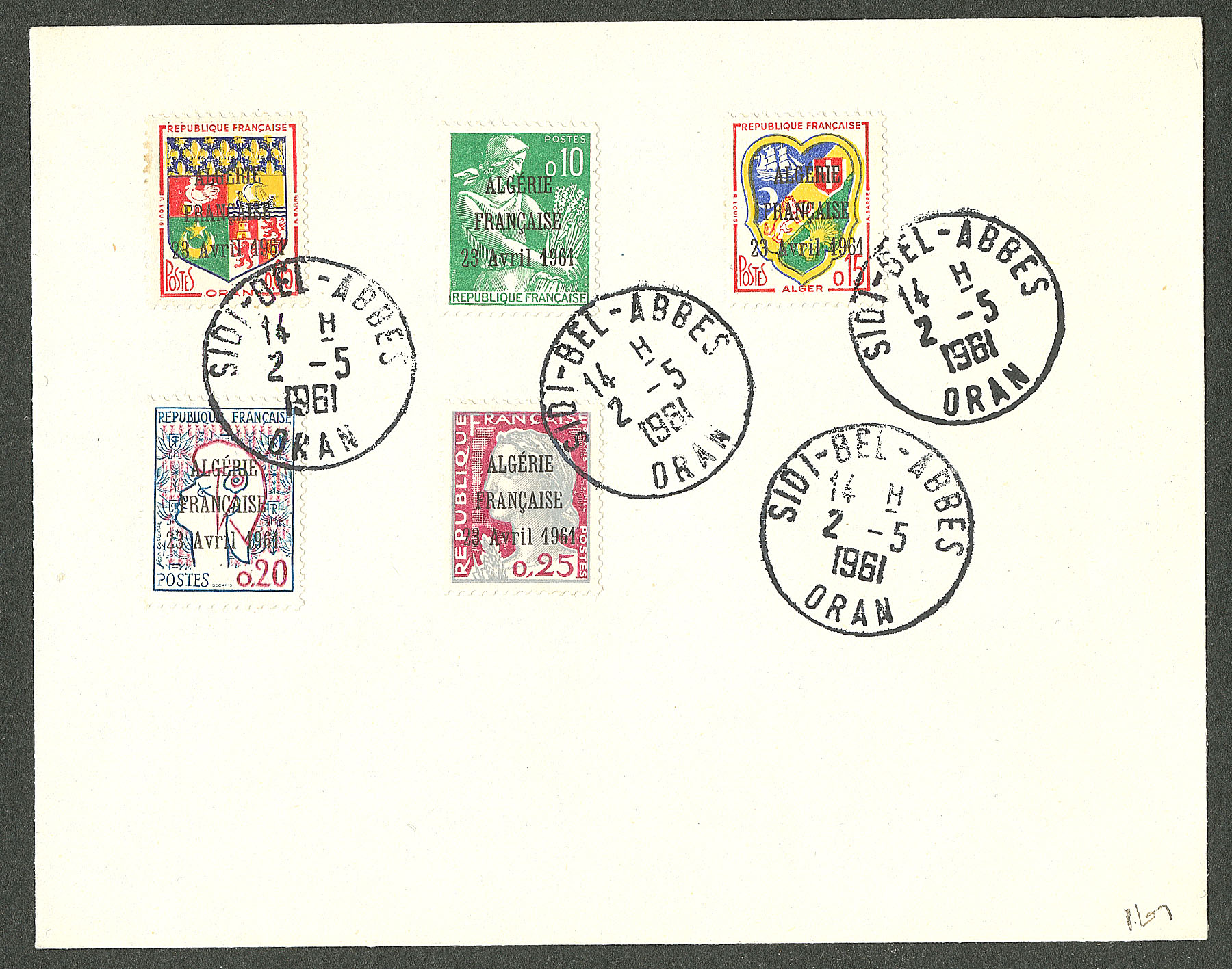 1525 | ALGERIE. Lettre.Surcharge "Algérie française 23 Avril 1961" pour le putsch d'Alger. Nos 1230A à 1232 + 1263 + 1282, obl cad Sidi-Bel-Abbes 2.5.61 sur enveloppe. - TB | 5 | - | 50€ | vendu 95€ | |