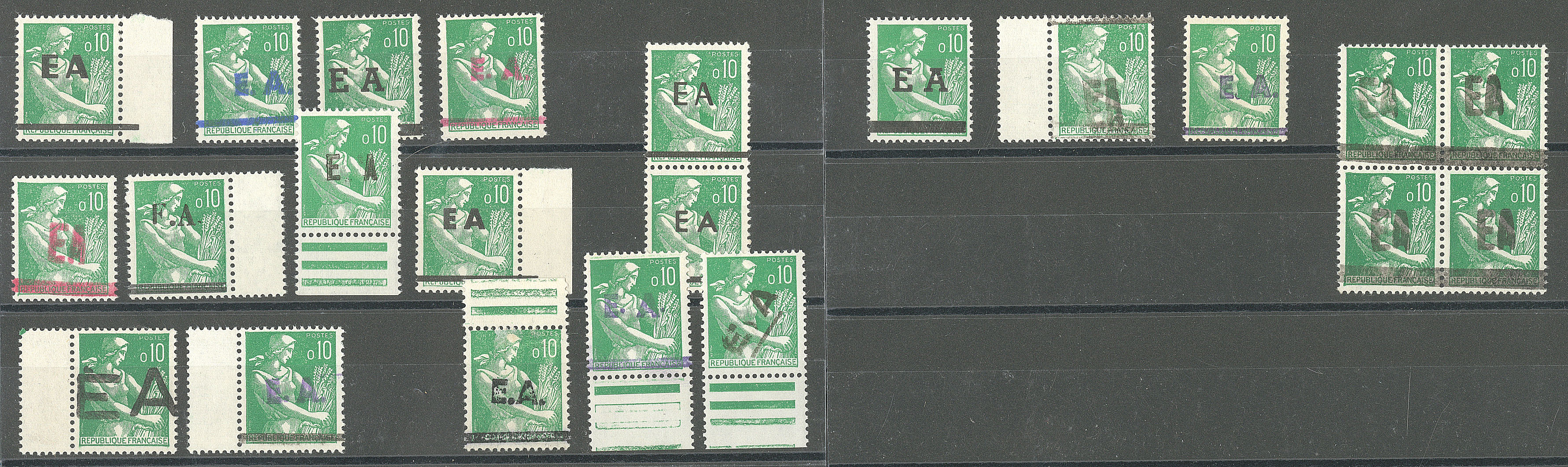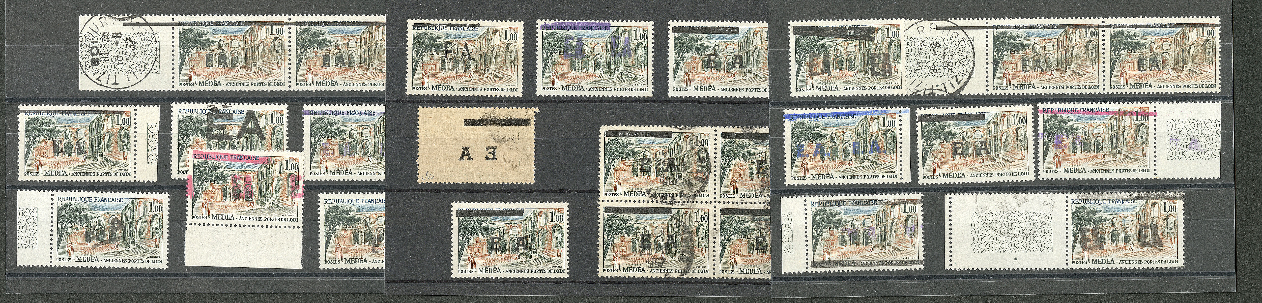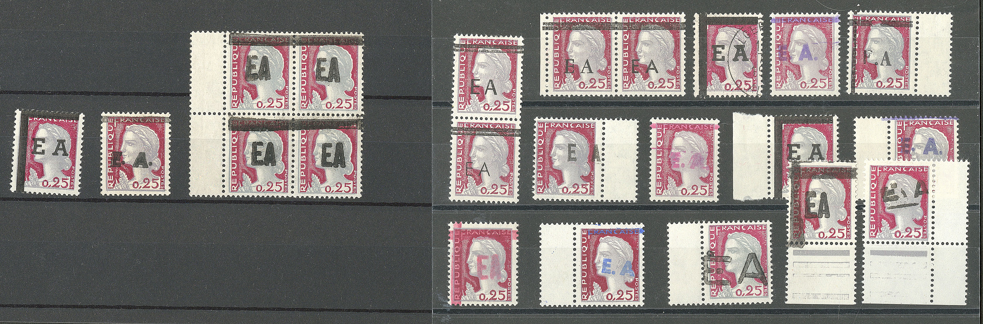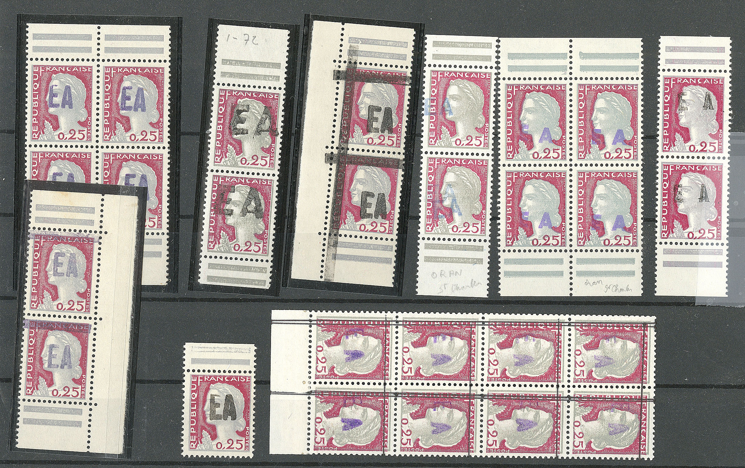 | ** | 1532 | ALGERIE. ** Surcharge "E A" sur timbres de France. No 1318, 25 ex surcharges différentes dont un recto-verso et un bloc de quatre. - TB | 25 | - | 150€ | vendu 168€ | |