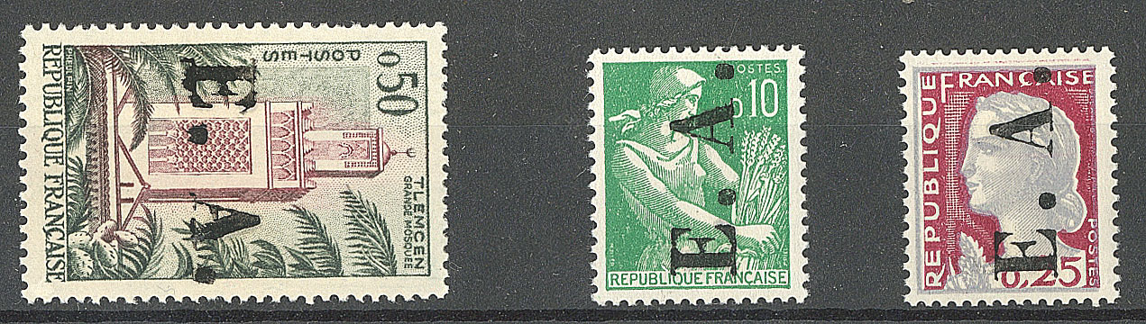 | ** | 1527 | ALGERIE. ** Surcharge "E A" sur timbres de France. Nos 1231, 1238 et 1263 avec surcharge d'Oran-Miramar. - TB | 3 | - | 100€ | - | |