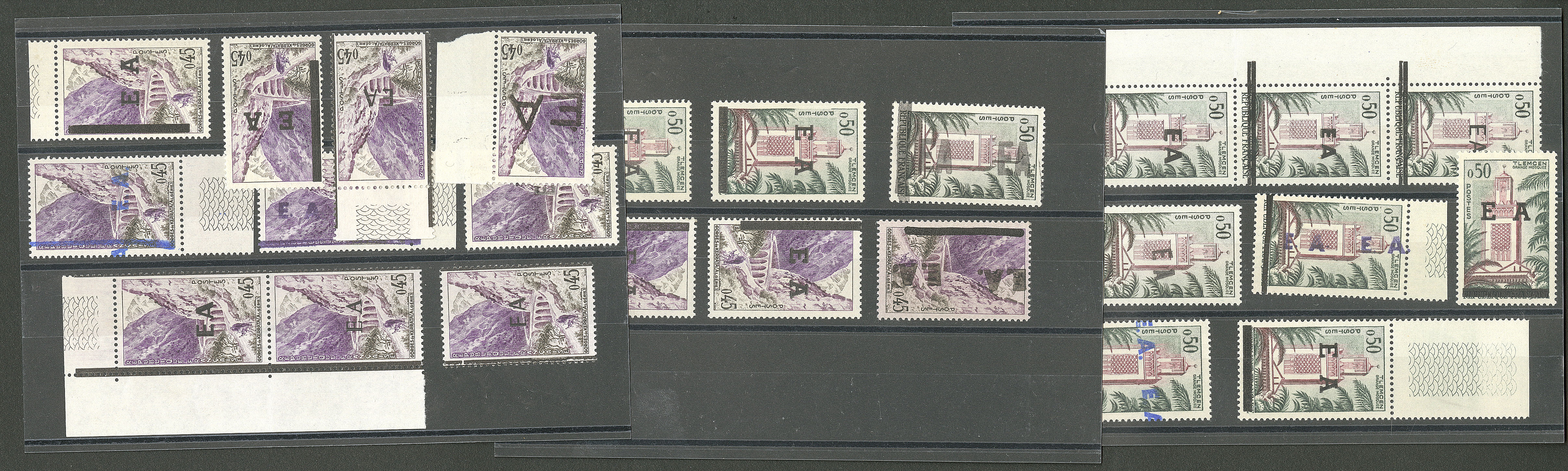 | ** | 1530 | ALGERIE. ** Surcharge "E A" sur timbres de France. No 1263, 9 paires verticales avec bords de carnet, un bloc de huit de carnet et un détaché, surcharges différentes. - TB | 27 | - | 250€ | - | |