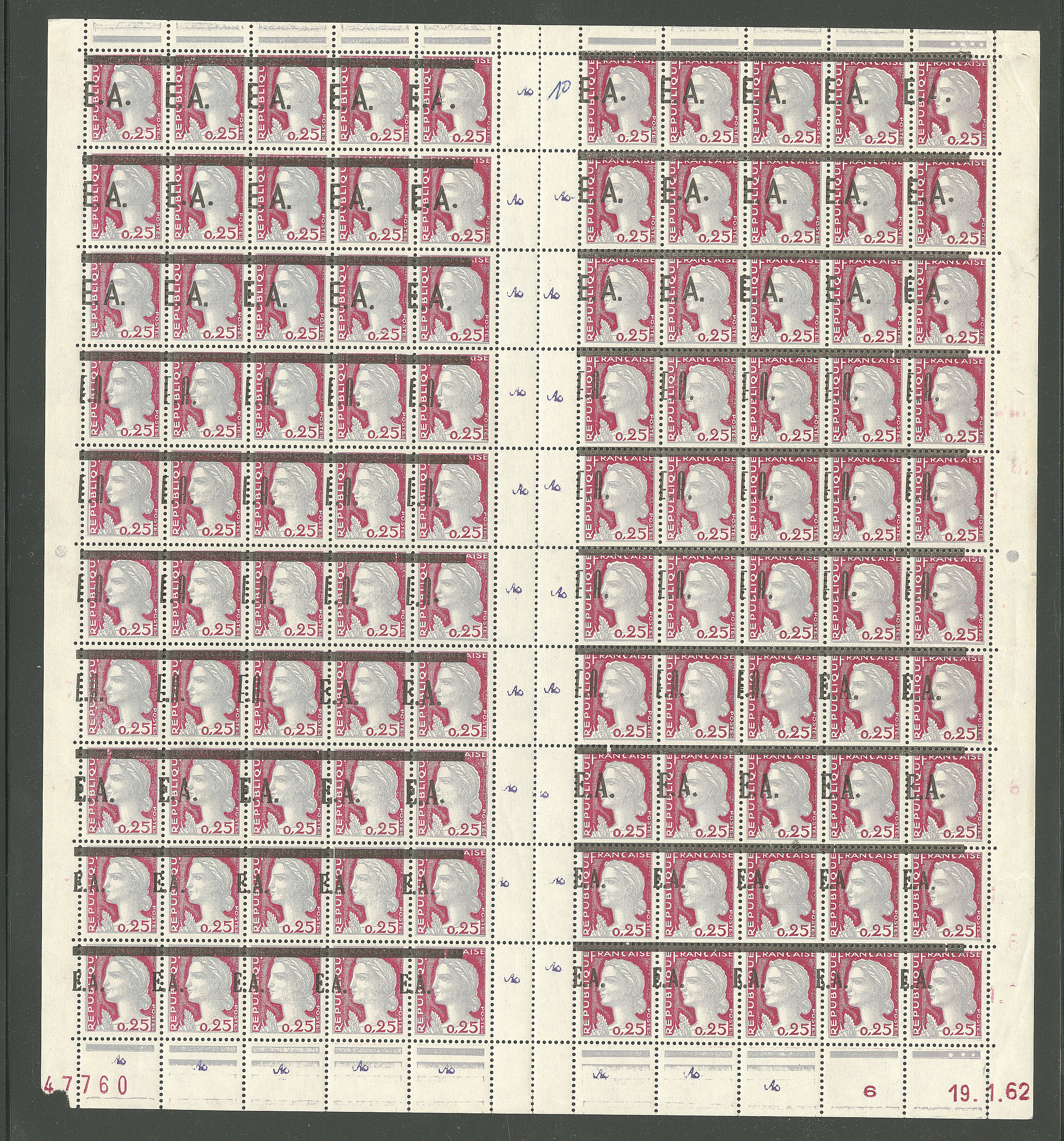 | ** | 1531 | ALGERIE. ** Surcharge "E A" sur timbres de France. No 1263, feuille complète de 100t avec surcharge de Tlemcen (types 1 à 4), cd 19.1.62. - TB | 100 | - | 400€ | - | |
