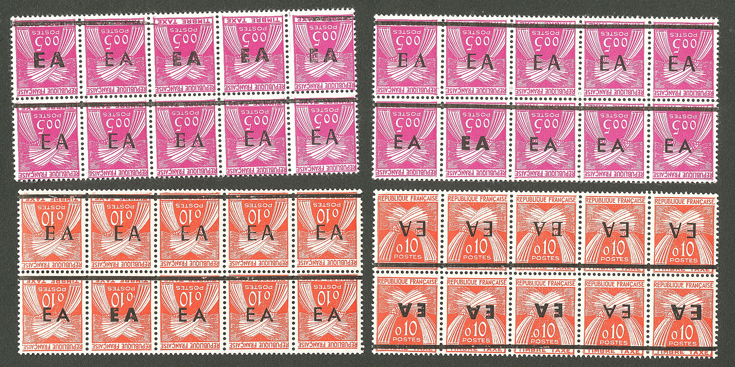 | ** | 1534 | ALGERIE. ** Surcharge "E A" sur timbres de France. Taxe. Nos 54, 55, 2 bloc de dix de chaque valeur avec surcharge renversée de Tizi-Ouzou. - TB | 40 | - | 120€ | vendu 137€ | |