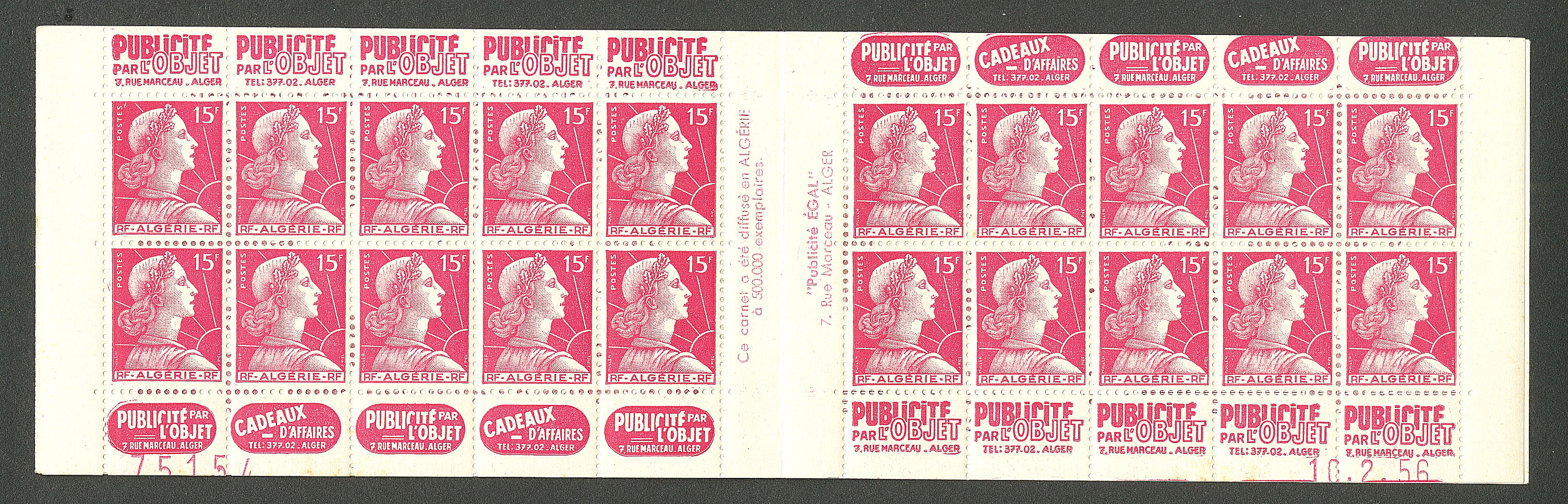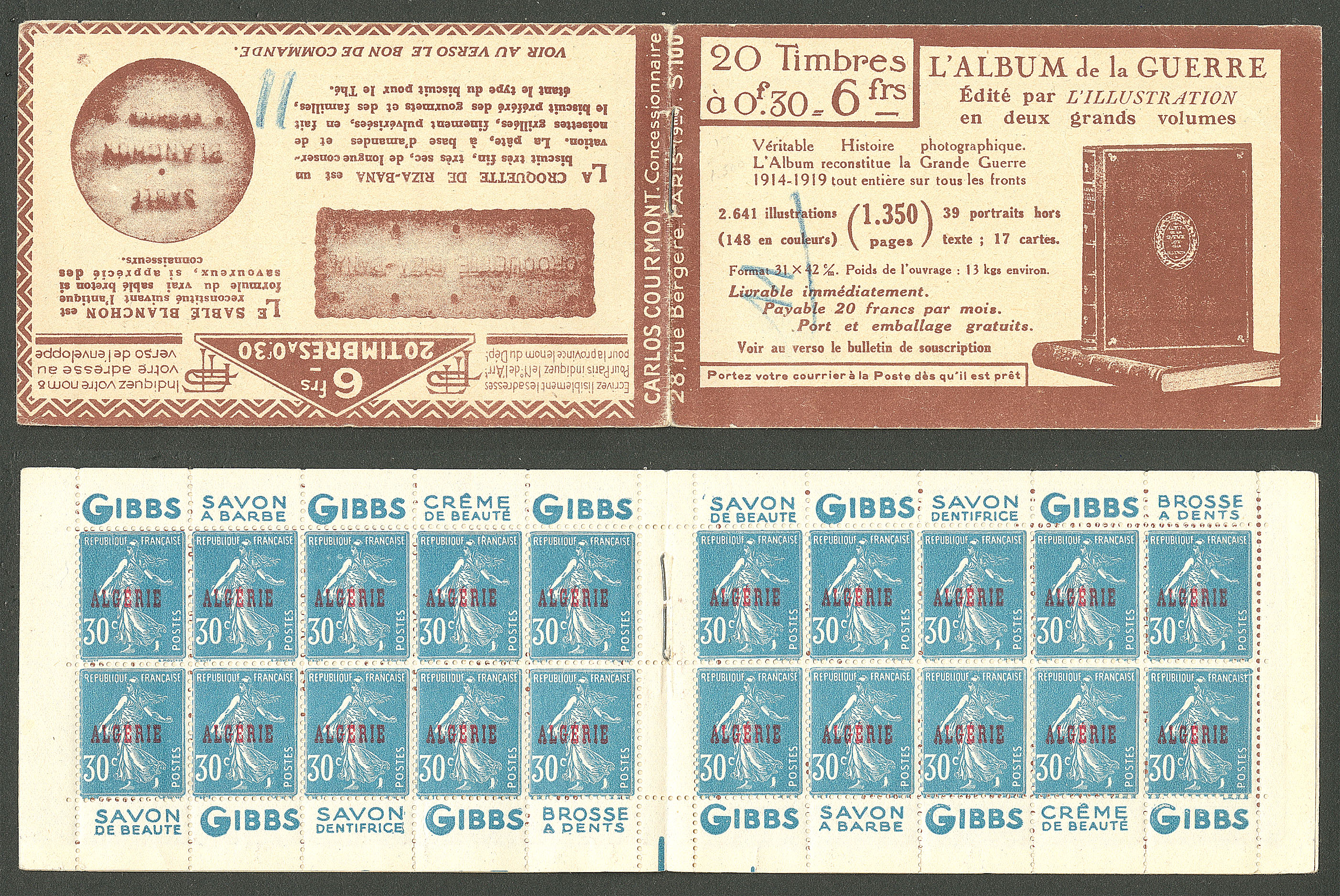 | ** | 1539 | ALGERIE. ** Carnets. No 17-C1 (Yv. C17-5), carnet de 20t #17a, S.100, couv. Illustration/Blanchon, Pub Gibbs, chiffre au crayon bleu sur couv mais TB (cote Yvert) | 650€ | 100€ | - | ||